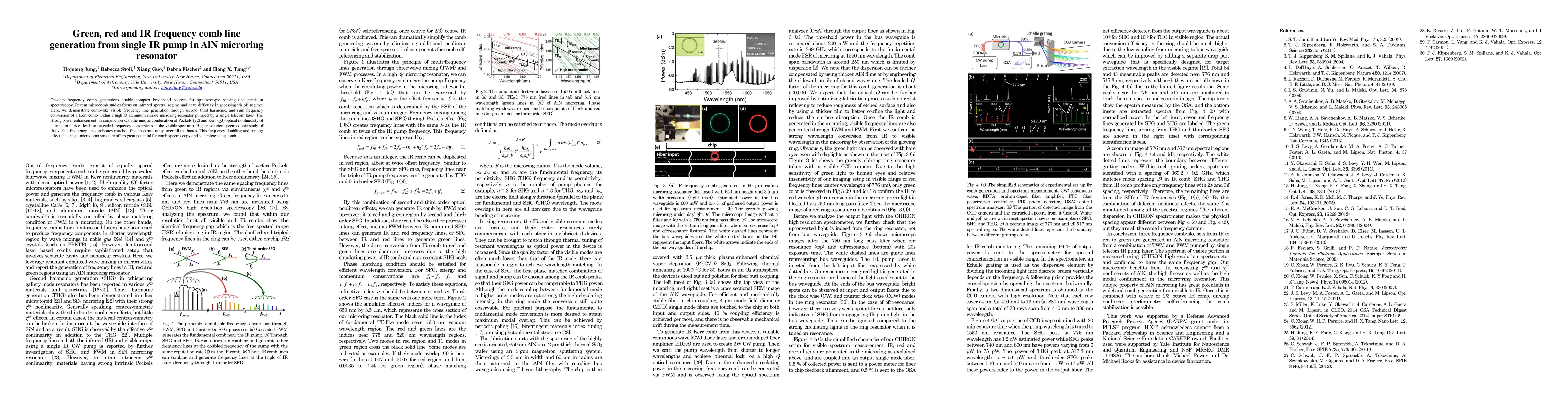 This research demonstrates on-chip generation of green, red, and infrared frequency comb lines from a single infrared pump in an aluminum nitride microring resonator, utilizing second and third harmonic generation along with sum frequency conversion. The method provides a compact broadband source for spectroscopic applications and offers potential for precision spectroscopy and self-referencing.