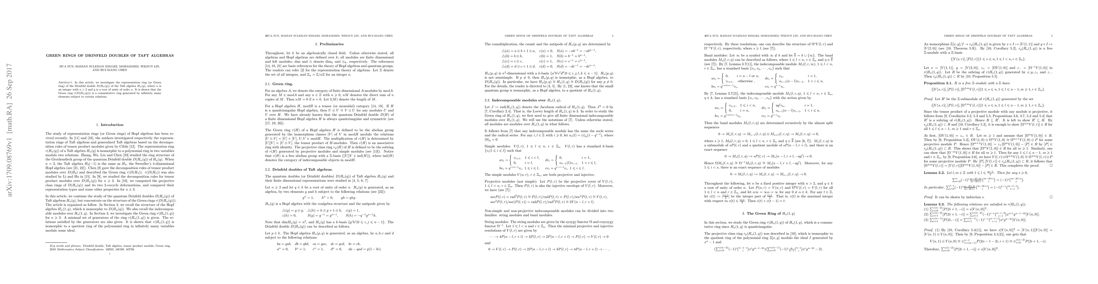 This paper studies the Green ring of the Drinfeld double $D(H_n(q))$ of the Taft algebra $H_n(q)$, demonstrating it is a commutative ring generated by infinitely many elements with specific relations.