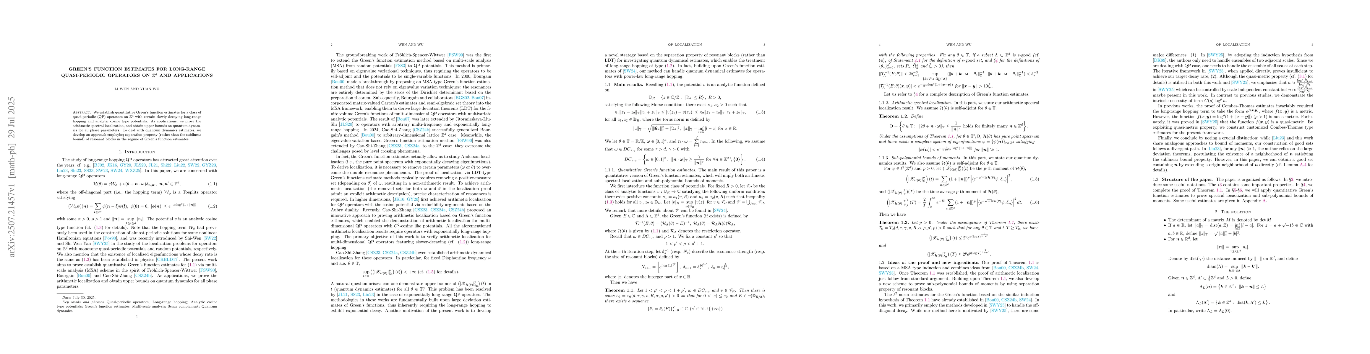 We establish quantitative Green's function estimates for a class of quasi-periodic (QP) operators on $\mathbb{Z}^d$ with certain slowly decaying long-range hopping and analytic cosine type potentials. As applications, we prove the arithmetic spectral localization, and obtain upper bounds on quantum dynamics for all phase parameters. To deal with quantum dynamics estimates, we develop an approach employing separation property (rather than the sublinear bound) of resonant blocks in the regime of Green's function estimates.