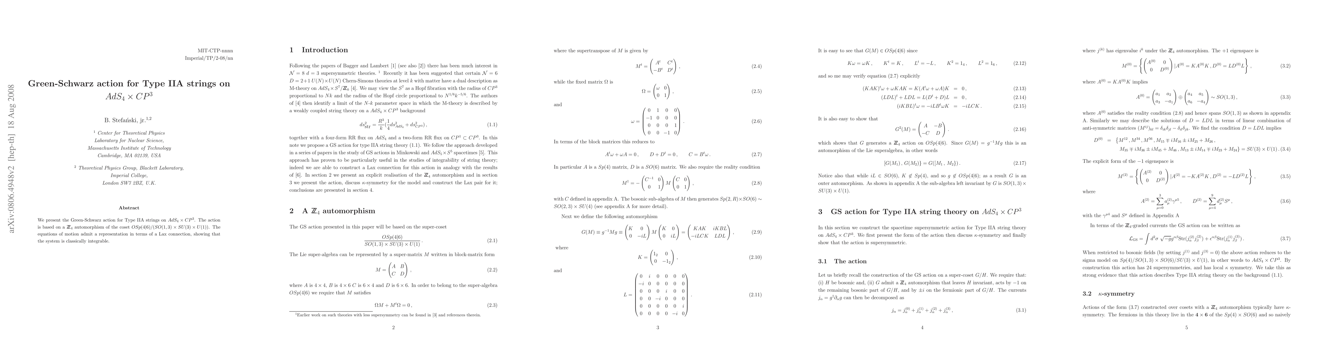 This paper presents the Green-Schwarz action for Type IIA strings on the background $AdS_4\times CP^3$, utilizing a $\Zop_4$ automorphism. The derived equations of motion exhibit classical integrability through a Lax connection representation.