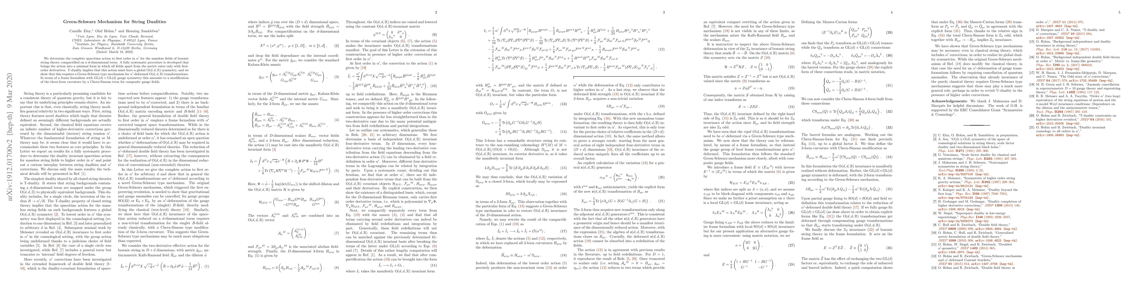We determine the complete spacetime action to first order in $\alpha'$ for the massless fields of bosonic string theory compactified on a $d$-dimensional torus. A fully systematic procedure is developed that brings the action into a minimal form in which all fields apart from the metric enter only with first-order derivatives. T-duality implies that this action must have a global $\mathrm{O}(d,d,\mathbb{R})$ symmetry, and we show that this requires a Green-Schwarz type mechanism for $\alpha'$-deformed $\mathrm{O}(d,d,\mathbb{R})$ transformations. In terms of a frame formalism with ${\rm GL}(d)\times {\rm GL}(d)$ gauge symmetry this amounts to a modification of the three-form curvature by a Chern-Simons term for composite gauge fields.