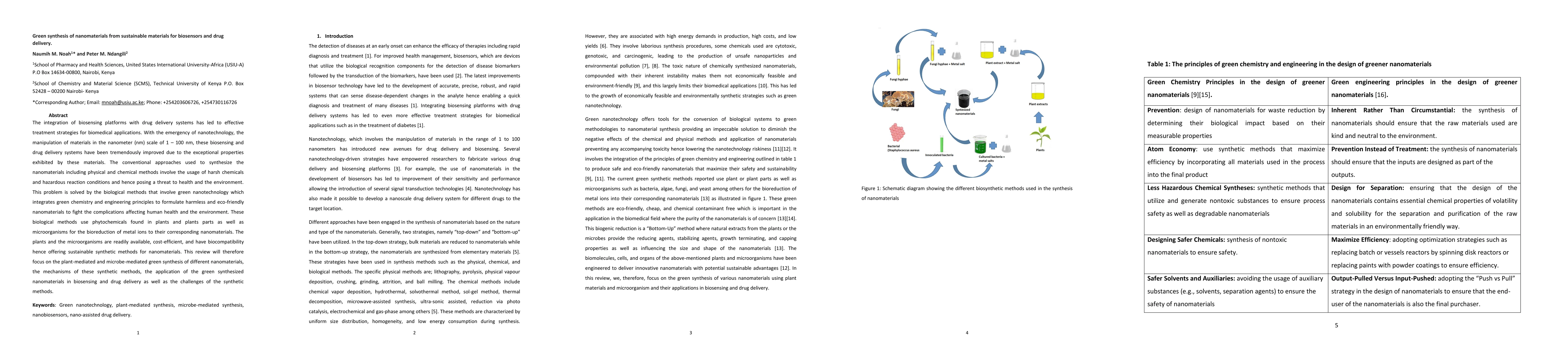 The integration of biosensing platforms with drug delivery systems has led to effective treatment strategies for biomedical applications. With the emergency of nanotechnology, the manipulation of materials in the nanometer, these biosensing and drug delivery systems have been tremendously improved due to the exceptional properties exhibited by these materials. The conventional approaches used to synthesize the nanomaterials including physical and chemical methods involve the usage of harsh chemicals and hazardous reaction conditions and hence posing a threat to health and the environment. This problem is solved by the biological methods that involve green nanotechnology which integrates green chemistry and engineering principles to formulate harmless and eco-friendly nanomaterials to fight the complications affecting human health and the environment. These biological methods use phytochemicals found in plants and plants parts as well as microorganisms for the bioreduction of metal ions to their corresponding nanomaterials. The plants and the microorganisms are readily available, cost-efficient, and have biocompatibility hence offering sustainable synthetic methods for nanomaterials. This review will therefore focus on the plant-mediated and microbe-mediated green synthesis of different nanomaterials, the mechanisms of these synthetic methods, the application of the green synthesized nanomaterials in biosensing and drug delivery as well as the challenges of the synthetic methods.