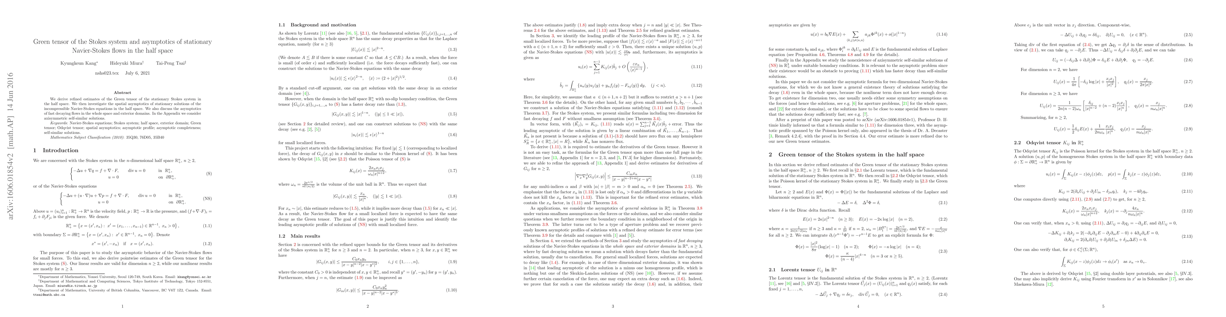 This paper derives refined estimates for the Green tensor of the stationary Stokes system in the half space and examines the spatial asymptotics of stationary incompressible Navier-Stokes flows in the same region, also discussing fast decaying flows in whole and exterior domains. An Appendix explores axisymmetric self-similar solutions.