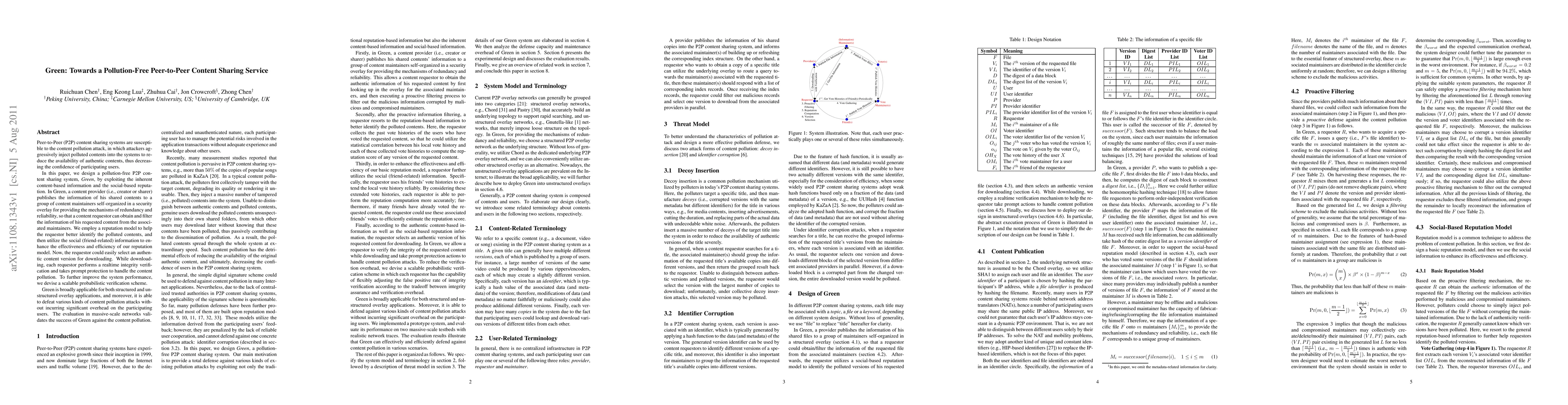 This paper introduces Green, a pollution-free P2P content sharing system that leverages content-based information and social reputation to filter polluted contents. It employs a scalable probabilistic verification scheme and a reputation model enhanced by social information to ensure authentic content selection and integrity.