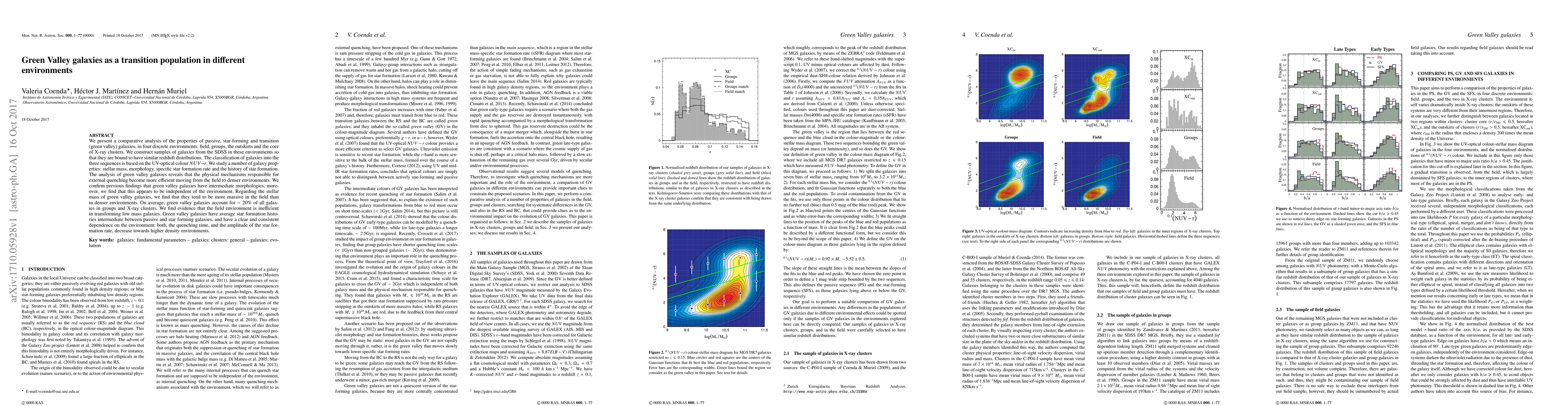 We present a comparative analysis of the properties of passive, star-forming and transition (green valley) galaxies, in four discrete environments: field, groups, the outskirts and the core of X-ray clusters. We construct samples of galaxies from the SDSS in these environments so that they are bound to have similar redshift distributions. The classification of galaxies into the three sequences is based on the UV-optical colour $NUV-r$. We study a number of galaxy properties: stellar mass, morphology, specific star formation rate and the history of star formation. The analysis of green valley galaxies reveals that the physical mechanisms responsible for external quenching become more efficient moving from the field to denser environments. We confirm previous findings that green valley galaxies have intermediate morphologies, moreover, we find that this appears to be independent of the environment. Regarding the stellar mass of green valley galaxies, we find that they tend to be more massive in the field than in denser environments. On average, green valley galaxies account for $\sim 20\%$ of all galaxies in groups and X-ray clusters. We find evidence that the field environment is inefficient in transforming low mass galaxies. Green valley galaxies have average star formation histories intermediate between passive and star forming galaxies, and have a clear and consistent dependence on the environment: both, the quenching time, and the amplitude of the star formation rate, decrease towards higher density environments.