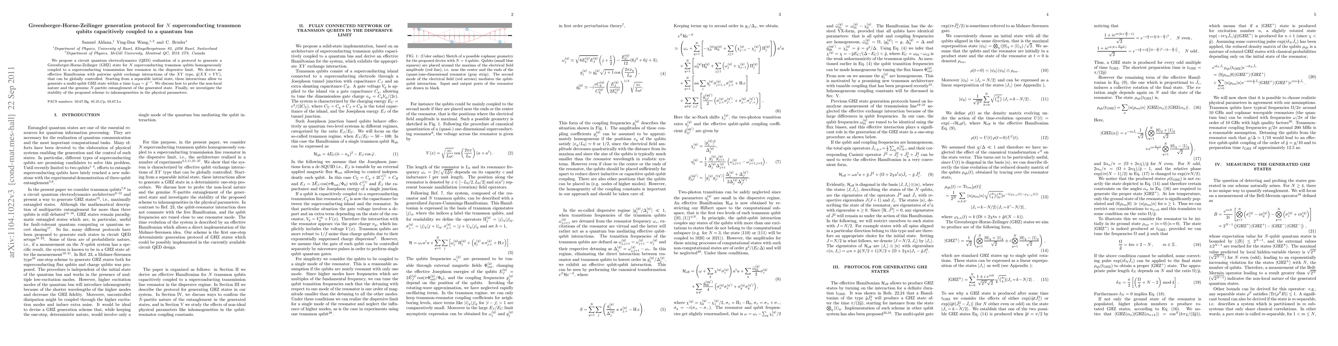 This paper proposes a protocol for generating a Greenberger-Horne-Zeilinger (GHZ) state in a circuit quantum electrodynamics system using $N$ superconducting transmon qubits coupled to a quantum bus. The authors derive an effective Hamiltonian to control the pairwise qubit interactions and discuss the protocol's stability against parameter inhomogeneities.