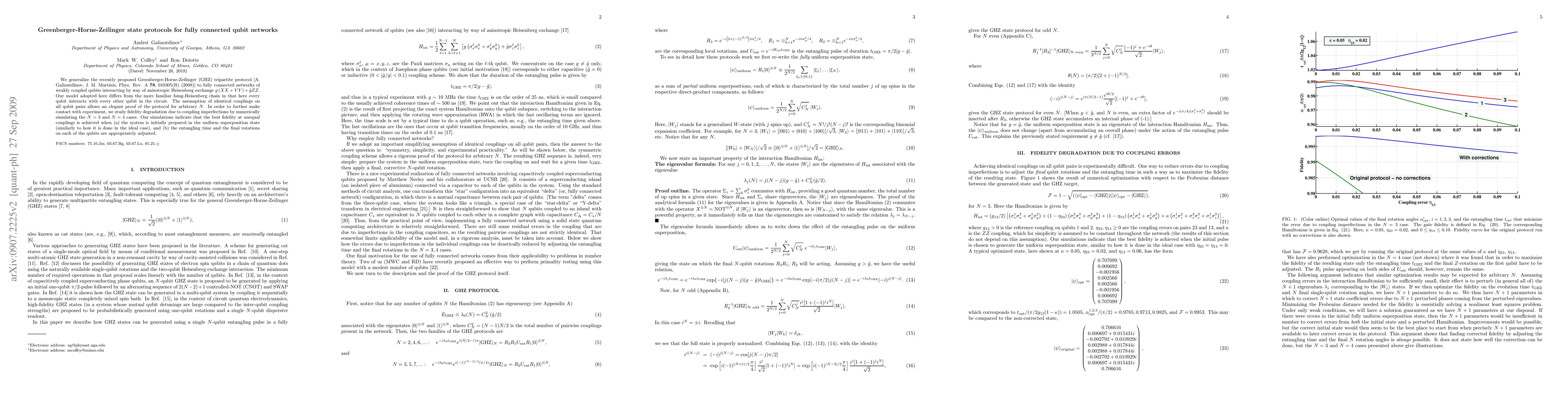 This paper generalizes a Greenberger-Horne-Zeilinger (GHZ) protocol for qubit networks, enabling every qubit to interact with all others. The study proves the protocol for any number of qubits (N) under identical coupling assumptions and simulates fidelity degradation for N=3 and N=4, suggesting optimal conditions for initial state preparation and rotation timing to maintain high fidelity in the presence of coupling imperfections.