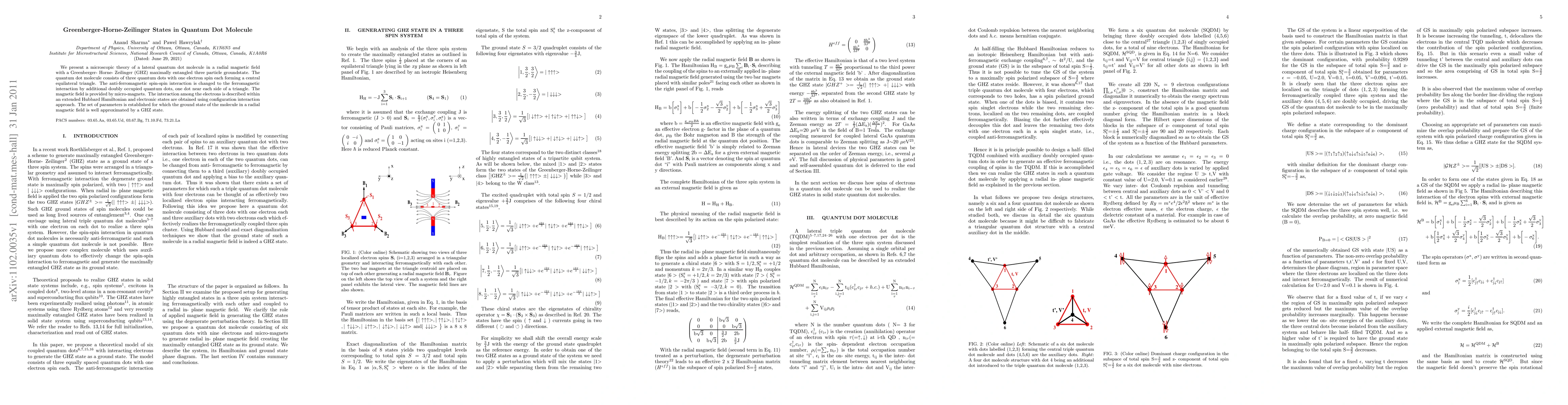 This paper develops a microscopic theory for a lateral quantum dot molecule under a radial magnetic field, showing that it can exhibit a Greenberger-Horne-Zeilinger (GHZ) maximally entangled ground state. The model involves three quantum dots with electron spins arranged in an equilateral triangle, where the spin interaction is manipulated to be ferromagnetic via additional doubly occupied dots, enabling the formation of a GHZ state.