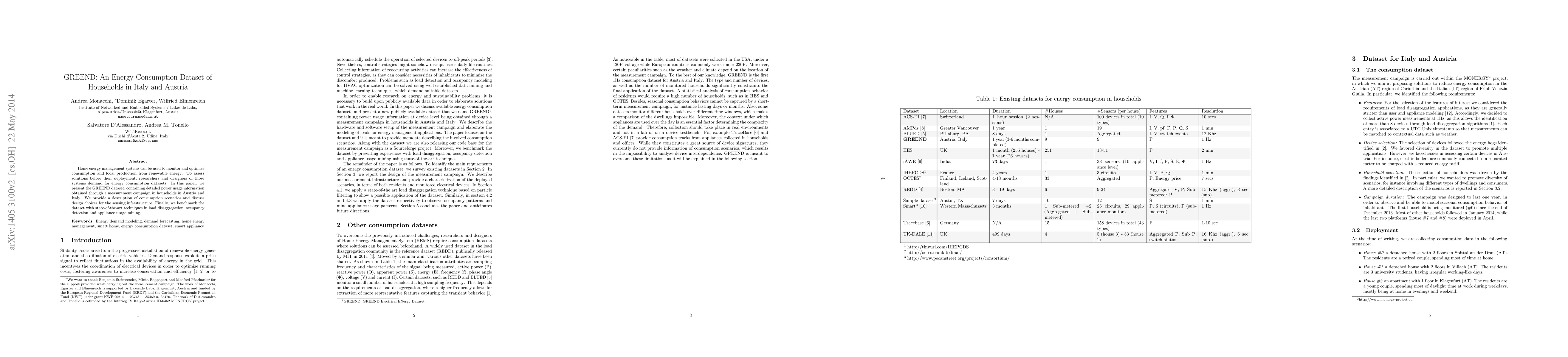 The GREEND dataset presents detailed power usage information from households in Austria and Italy, offering scenarios and sensing infrastructure details for energy consumption research. It benchmarks techniques in load disaggregation, occupancy detection, and appliance usage mining.