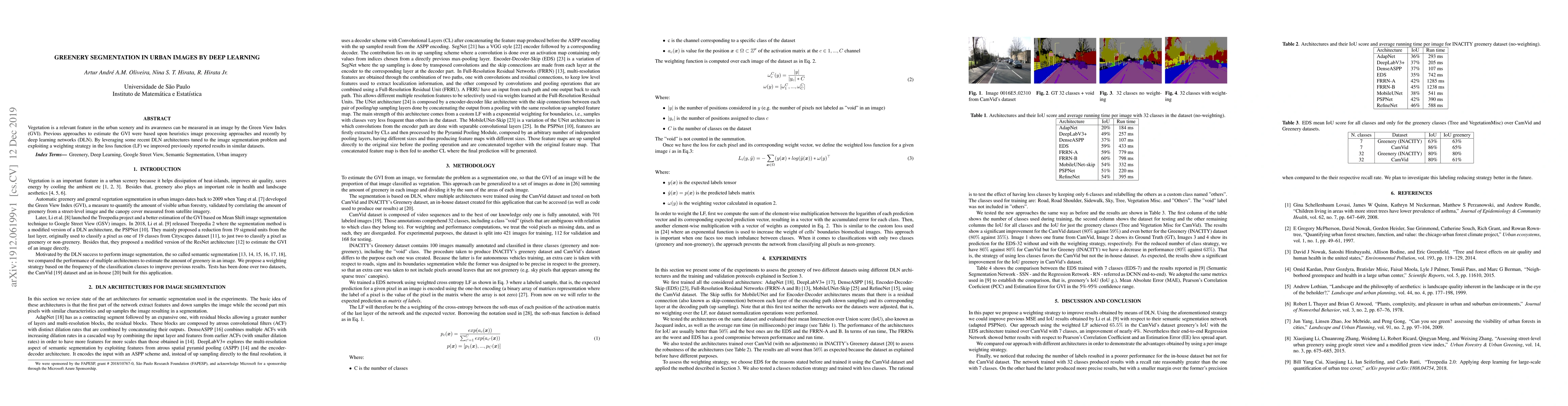 Vegetation is a relevant feature in the urban scenery and its awareness can be measured in an image by the Green View Index (GVI). Previous approaches to estimate the GVI were based upon heuristics image processing approaches and recently by deep learning networks (DLN). By leveraging some recent DLN architectures tuned to the image segmentation problem and exploiting a weighting strategy in the loss function (LF) we improved previously reported results in similar datasets.