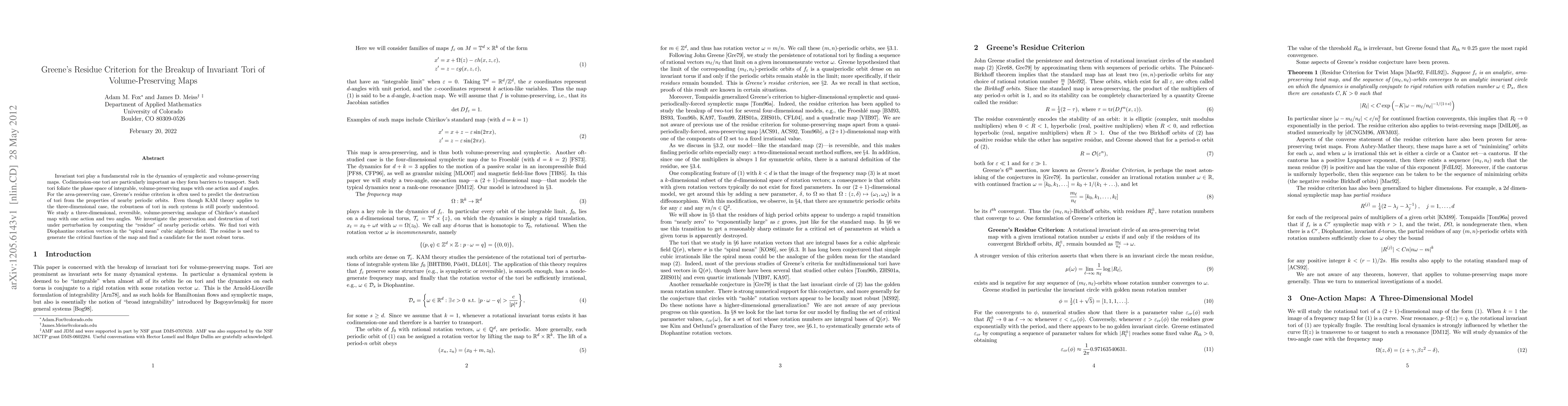 This paper explores the breakup of invariant tori in three-dimensional volume-preserving maps using Greene's residue criterion. It studies a specific map, finding that tori with Diophantine rotation vectors remain robust, and uses the residue to identify the most resilient torus.