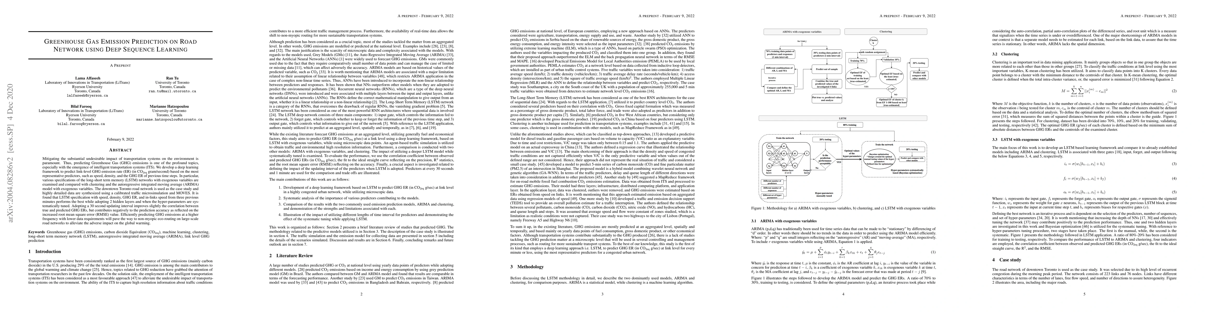 This paper develops a deep learning framework using LSTM networks to predict link-level greenhouse gas emissions on the Toronto road network based on traffic data. The best performing LSTM model, with speed, density, and previous GHG emission rates as predictors, shows improved correlation but slightly lower accuracy when updated more frequently.