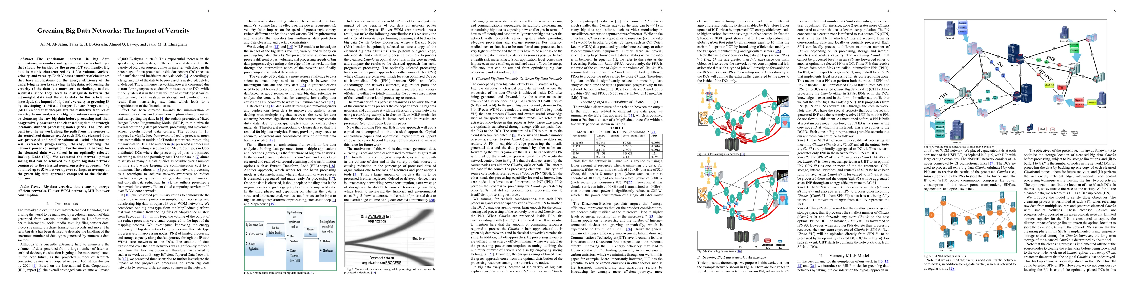 This research proposes a method using Mixed Integer Linear Programming (MILP) to address the energy efficiency challenges posed by big data veracity. By cleansing raw big data and processing it progressively at strategic nodes (Processing Nodes, PNs) along the network path to datacenters, the study demonstrates up to 52% reduction in network power consumption compared to traditional approaches.