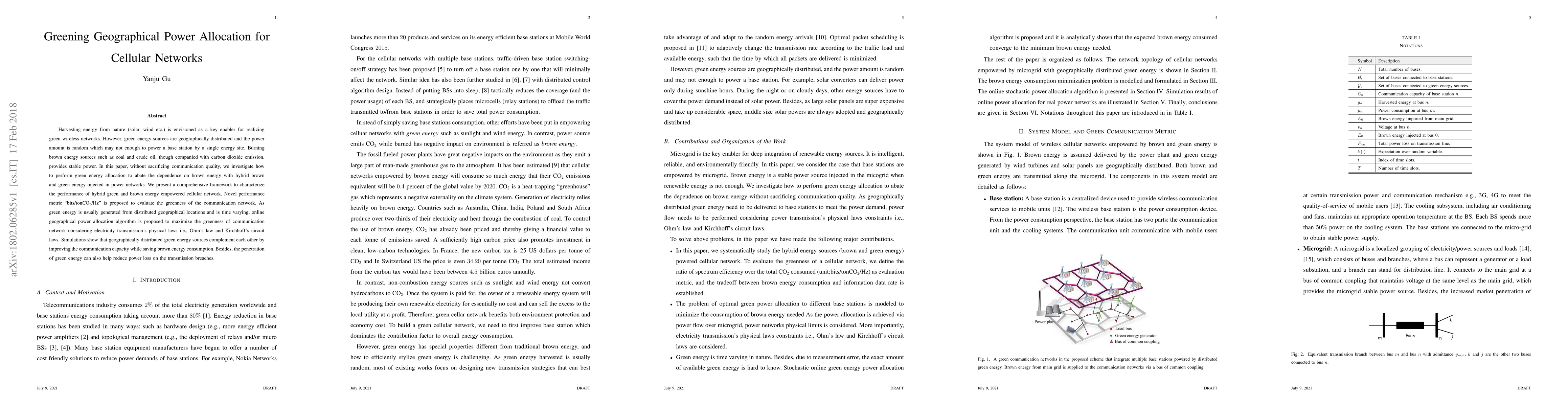 Harvesting energy from nature (solar, wind etc.) is envisioned as a key enabler for realizing green wireless networks. However, green energy sources are geographically distributed and the power amount is random which may not enough to power a base station by a single energy site. Burning brown energy sources such as coal and crude oil, though companied with carbon dioxide emission, provides stable power. In this paper, without sacrificing communication quality, we investigate how to perform green energy allocation to abate the dependence on brown energy with hybrid brown and green energy injected in power networks. We present a comprehensive framework to characterize the performance of hybrid green and brown energy empowered cellular network. Novel performance metric "bits/ton\ce{CO2}/Hz" is proposed to evaluate the greenness of the communication network. As green energy is usually generated from distributed geographical locations and is time varying, online geographical power allocation algorithm is proposed to maximize the greenness of communication network considering electricity transmission's physical laws i.e., Ohm's law and Kirchhoff's circuit laws. Simulations show that geographically distributed green energy sources complement each other by improving the communication capacity while saving brown energy consumption. Besides, the penetration of green energy can also help reduce power loss on the transmission breaches.