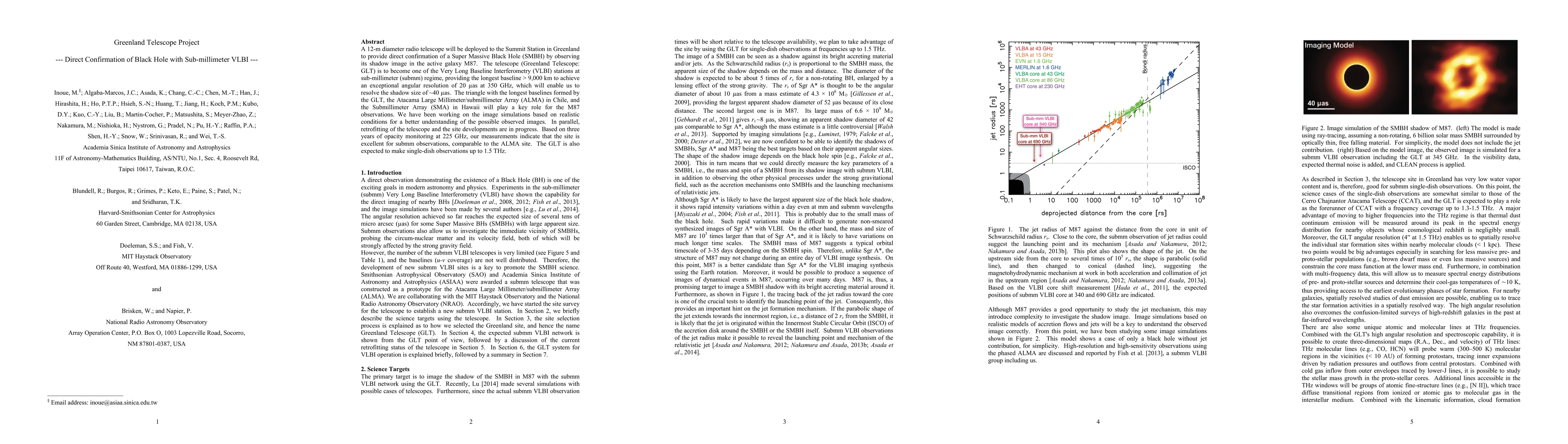 A 12-m diameter radio telescope will be deployed to the Summit Station in Greenland to provide direct confirmation of a Super Massive Black Hole (SMBH) by observing its shadow image in the active galaxy M87. The telescope (Greenland Telescope: GLT) is to become one of the Very Long Baseline Interferometry (VLBI) stations at sub-millimeter (submm) regime, providing the longest baseline > 9,000 km to achieve an exceptional angular resolution of 20 micro arc sec at 350 GHz, which will enable us to resolve the shadow size of ~40 micro arc sec. The triangle with the longest baselines formed by the GLT, the Atacama Large Millimeter/submillimeter Array (ALMA) in Chile, and the Submillimeter Array (SMA) in Hawaii will play a key role for the M87 observations. We have been working on the image simulations based on realistic conditions for a better understanding of the possible observed images. In parallel, retrofitting of the telescope and the site developments are in progress. Based on three years of opacity monitoring at 225 GHz, our measurements indicate that the site is excellent for submm observations, comparable to the ALMA site. The GLT is also expected to make single-dish observations up to 1.5 THz.
