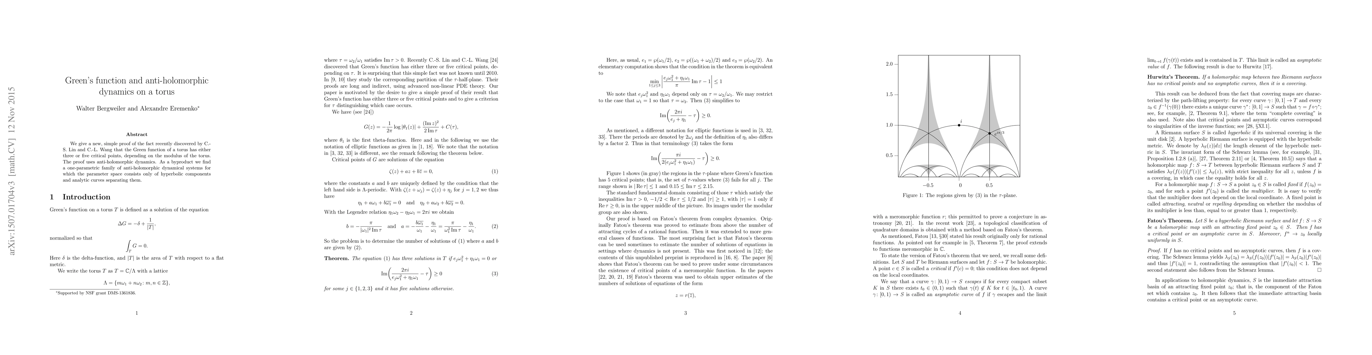 This paper presents a straightforward proof of Lin and Wang's finding that the Green function on a torus has either three or five critical points, contingent on the torus's modulus. The proof leverages anti-holomorphic dynamics and additionally identifies a one-parameter family of such systems with a parameter space composed solely of hyperbolic components and analytic curves.