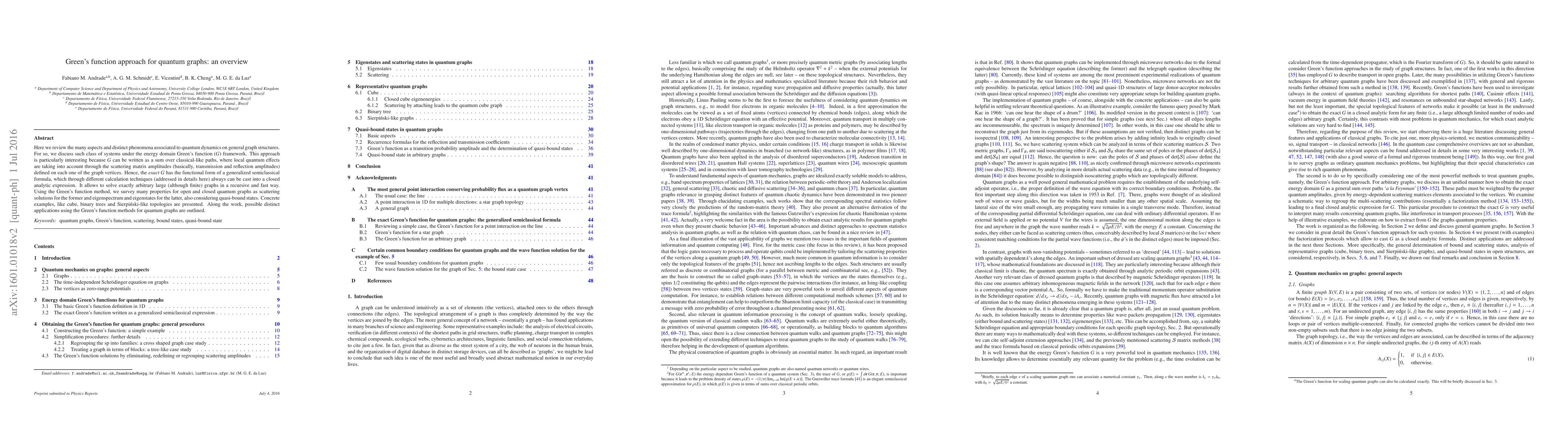 This paper reviews the Green's function approach for quantum dynamics on general graph structures, demonstrating its ability to solve large quantum graphs exactly through scattering matrix amplitudes. It surveys properties like scattering solutions and eigenspectrum, and presents examples of various topologies.