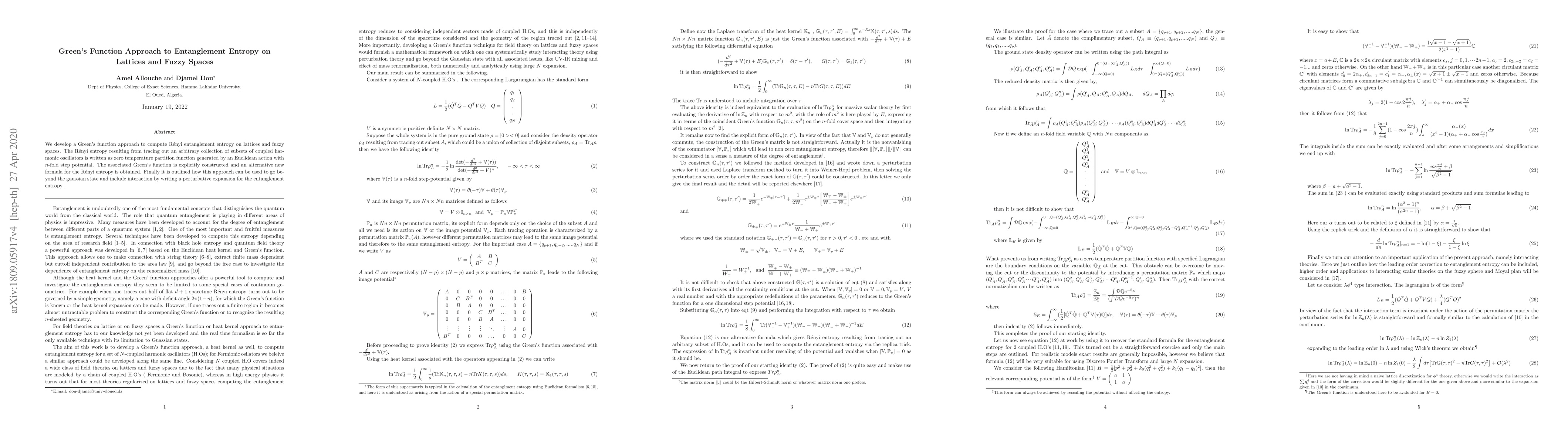 This paper develops a Green's function approach to compute Rényi entanglement entropy on lattices and fuzzy spaces, deriving a new formula for the entropy and extending the method to include interactions beyond Gaussian states through a perturbative expansion.