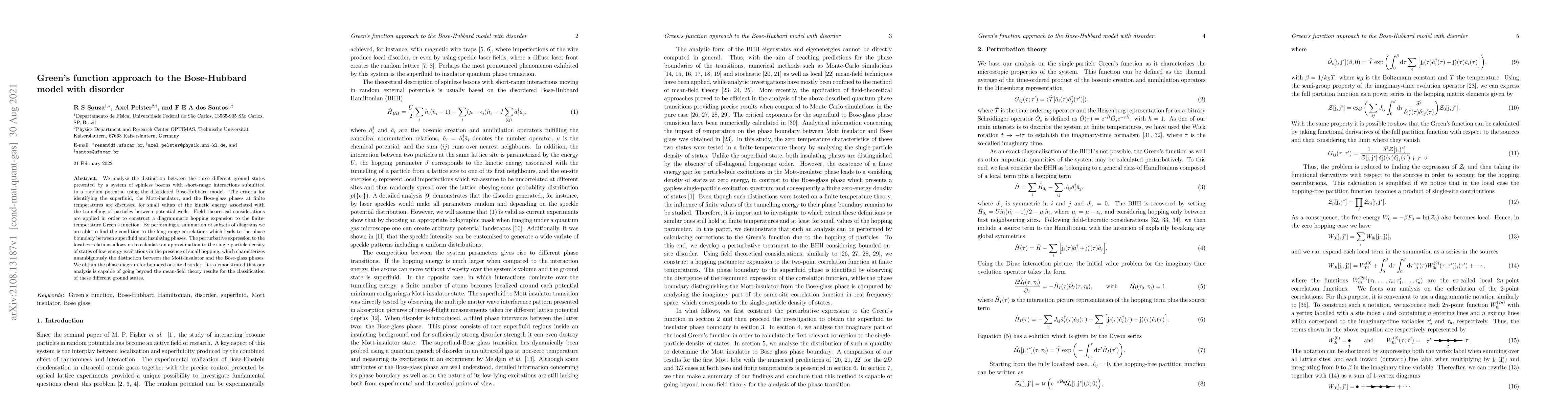 This paper uses the Green's function approach to analyze the Bose-Hubbard model with disorder, identifying the superfluid, Mott-insulator, and Bose-glass phases at finite temperatures. The study reveals the phase boundary between the superfluid and insulating phases through a diagrammatic hopping expansion, providing a more nuanced classification beyond mean-field theory.