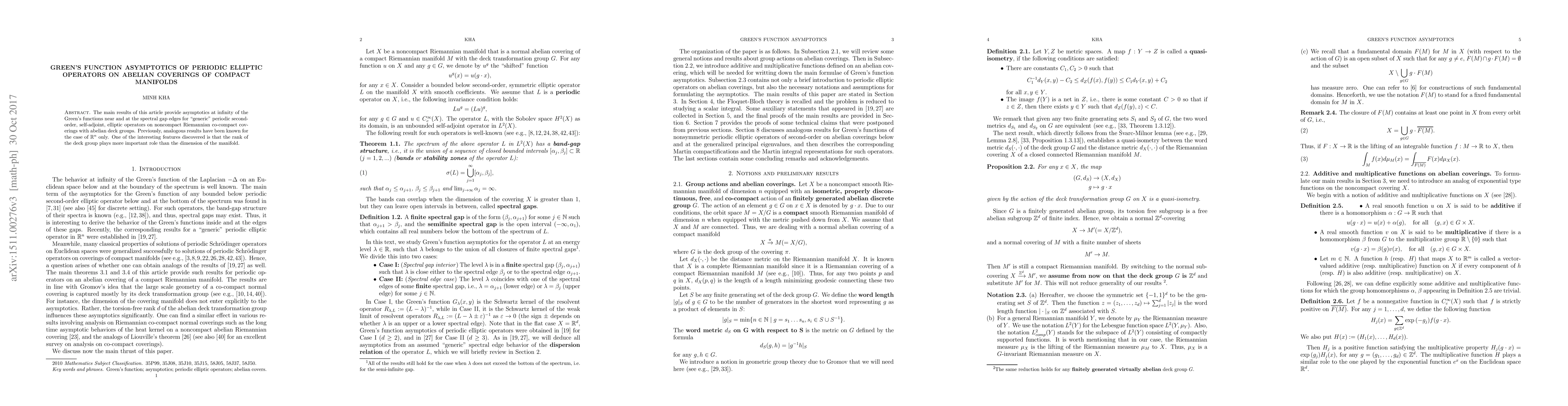 The main results of this article provide asymptotics at infinity of the Green's functions near and at the spectral gap edges for "generic" periodic second-order elliptic operators on noncompact Riemannian co-compact coverings with abelian deck groups. Previously, analogous results have been known for the case of $\mathbb{R}^n$ only. One of the interesting features discovered is that the rank of the deck group plays more important role than the dimension of the manifold.
