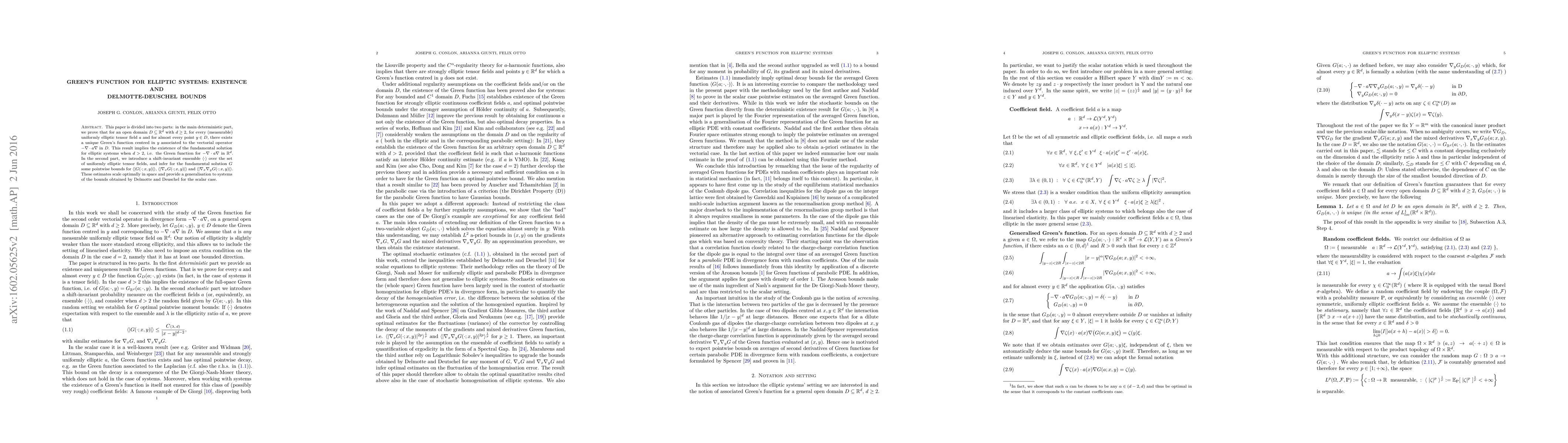 This paper proves the existence and uniqueness of the Green's function for uniformly elliptic tensor fields in open domains of dimension $d \geq 2$. It also establishes optimal pointwise bounds for the fundamental solution under stationarity assumptions, extending Delmotte-Deuschel bounds to elliptic systems.