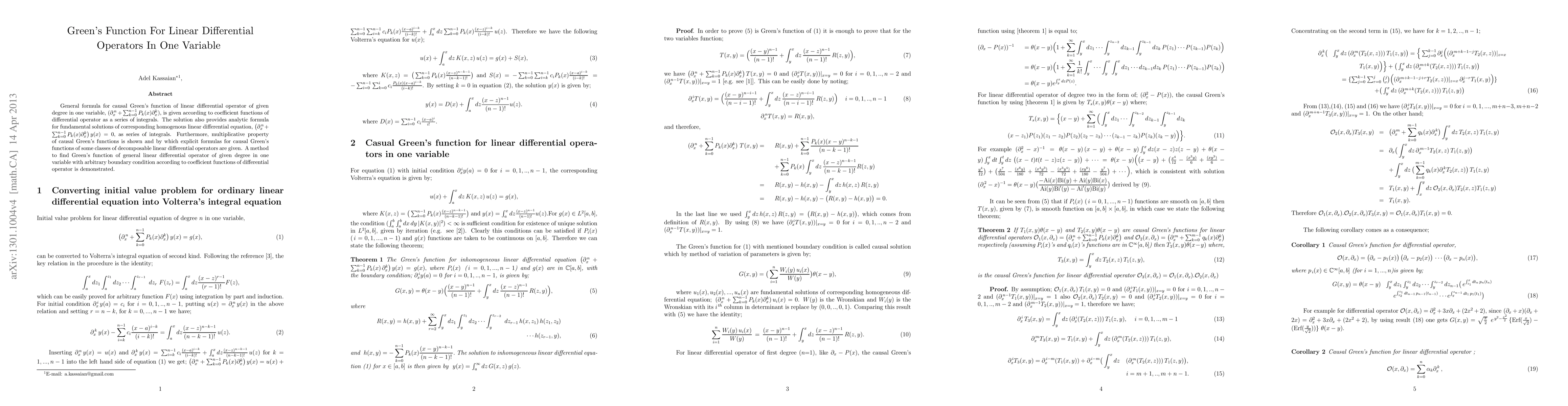 This paper presents a general formula for the causal Green's function of linear differential operators in one variable, expressed as a series of integrals based on the operator's coefficients. It also provides an analytic formula for fundamental solutions and demonstrates multiplicative properties of these Green's functions.
