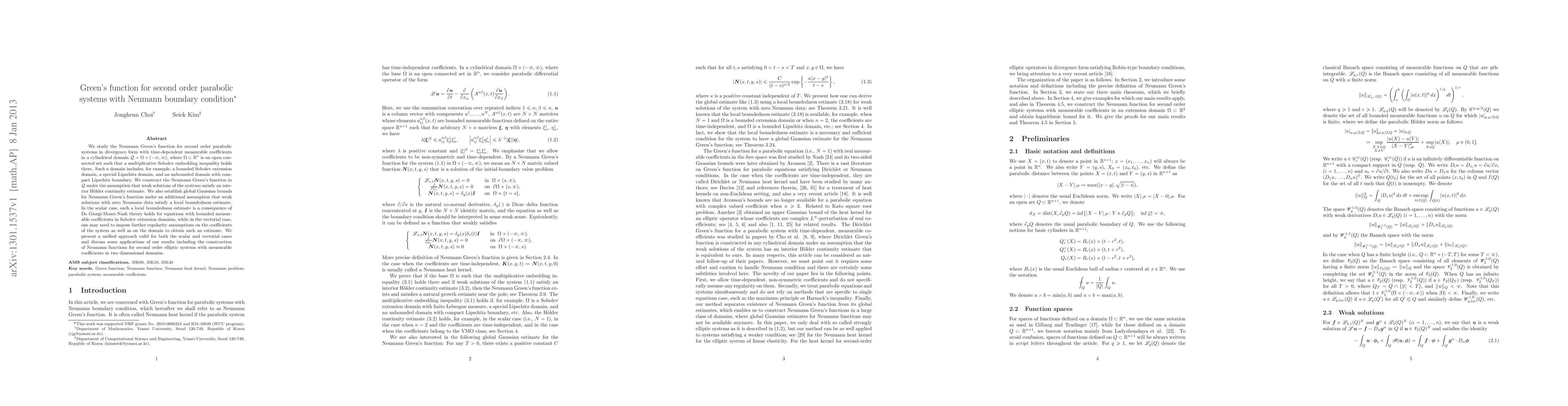We study the Neumann Green's function for second order parabolic systems in divergence form with time-dependent measurable coefficients in a cylindrical domain $\mathcal{Q}=\Omega\times (-\infty,\infty)$, where $\Omega\subset \mathbb{R}^n$ is an open connected set such that a multiplicative Sobolev embedding inequality holds there. Such a domain includes, for example, a bounded Sobolev extension domain, a special Lipschitz domain, and an unbounded domain with compact Lipschitz boundary. We construct the Neumann Green's function in $\mathcal{Q}$ under the assumption that weak solutions of the systems satisfy an interior H\"older continuity estimate. We also establish global Gaussian bounds for Neumann Green's function under an additional assumption that weak solutions with zero Neumann data satisfy a local boundedness estimate. In the scalar case, such a local boundedness estimate is a consequence of De Giorgi-Moser-Nash theory holds for equations with bounded measurable coefficients in Sobolev extension domains, while in the vectorial case, one may need to impose further regularity assumptions on the coefficients of the system as well as on the domain to obtain such an estimate. We present a unified approach valid for both the scalar and vectorial cases and discuss some applications of our results including the construction of Neumann functions for second order elliptic systems with measurable coefficients in two dimensional domains.