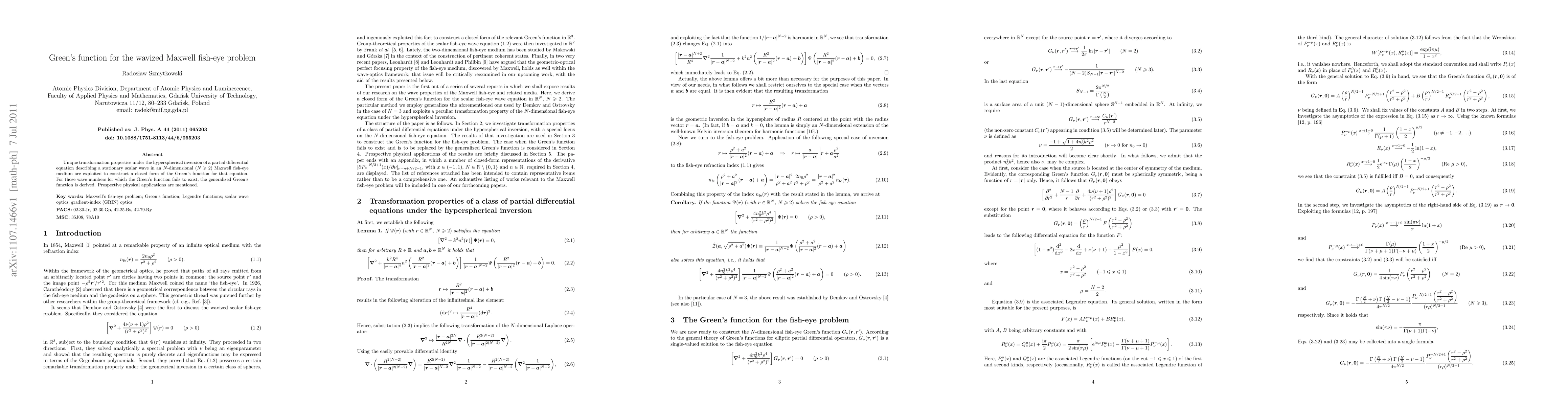 Unique transformation properties under the hyperspherical inversion of a partial differential equation describing a stationary scalar wave in an $N$-dimensional ($N\geqslant2$) Maxwell fish-eye medium are exploited to construct a closed form of the Green's function for that equation. For those wave numbers for which the Green's function fails to exist, the generalized Green's function is derived. Prospective physical applications are mentioned.
