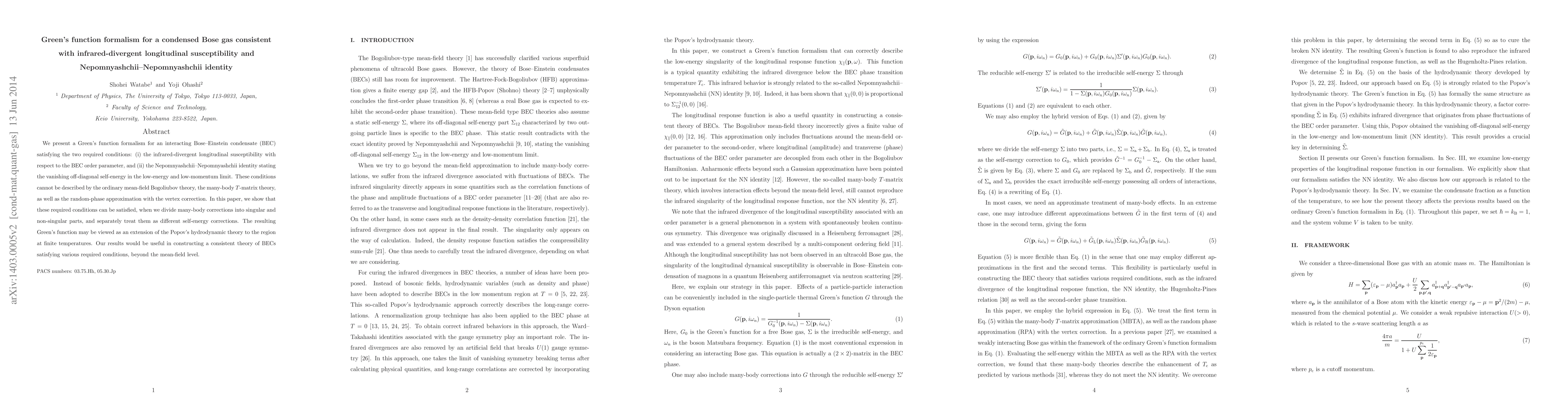 We present a Green's function formalism for an interacting Bose-Einstein condensate (BEC) satisfying the two required conditions: (i) the infrared-divergent longitudinal susceptibility with respect to the BEC order parameter, and (ii) the Nepomnyashchii-Nepomnyashchii identity stating the vanishing off-diagonal self-energy in the low-energy and low-momentum limit. These conditions cannot be described by the ordinary mean-field Bogoliubov theory, the many-body $T$-matrix theory, as well as the random-phase approximation with the vertex correction. In this paper, we show that these required conditions can be satisfied, when we divide many-body corrections into singular and non-singular parts, and separately treat them as different self-energy corrections. The resulting Green's function may be viewed as an extension of the Popov's hydrodynamic theory to the region at finite temperatures. Our results would be useful in constructing a consistent theory of BECs satisfying various required conditions, beyond the mean-field level.