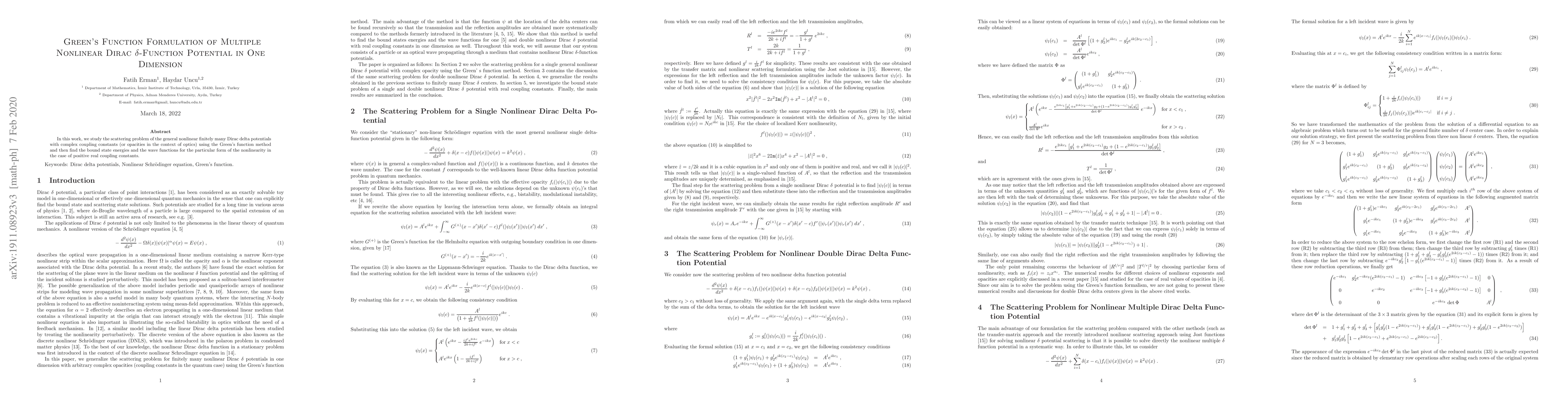 This paper investigates the scattering problem of multiple nonlinear Dirac delta potentials in one dimension using Green's function methods, and determines the bound state energies and wave functions for specific nonlinearities with positive real coupling constants.