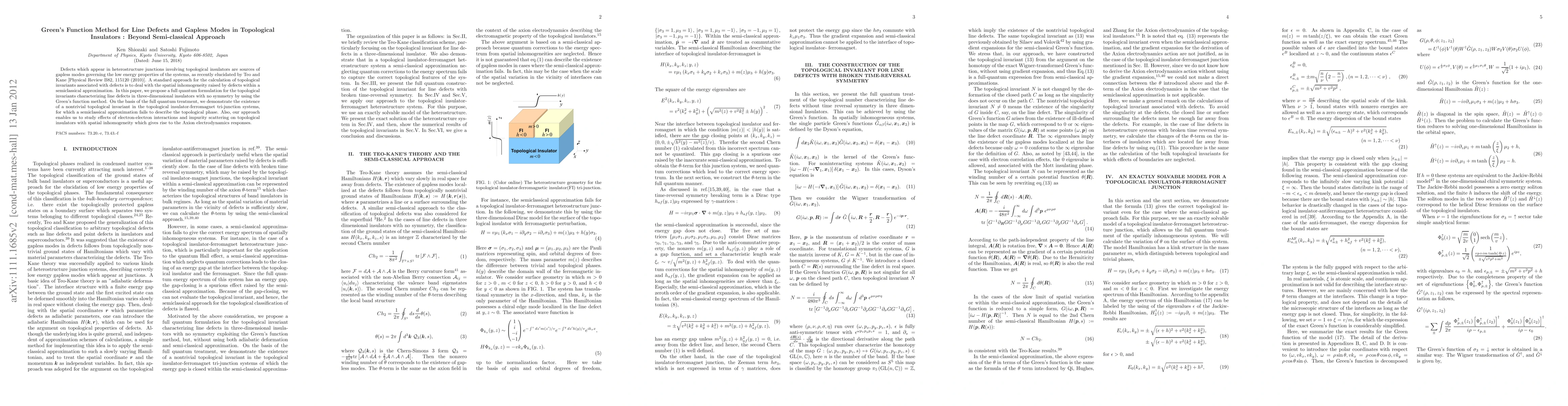 Defects which appear in heterostructure junctions involving topological insulators are sources of gapless modes governing the low energy properties of the systems, as recently elucidated by Teo and Kane [Physical Review B82, 115120 (2010)]. A standard approach for the calculation of topological invariants associated with defects is to deal with the spatial inhomogeneity raised by defects within a semiclassical approximation. In this paper, we propose a full quantum formulation for the topological invariants characterizing line defects in three-dimensional insulators with no symmetry by using the Green's function method. On the basis of the full quantum treatment, we demonstrate the existence of a nontrivial topological invariant in the topological insulator-ferromagnet tri-junction systems, for which a semiclassical approximation fails to describe the topological phase. Also, our approach enables us to study effects of electron-electron interactions and impurity scattering on topological insulators with spatial inhomogeneity which gives rise to the Axion electrodynamics responses.