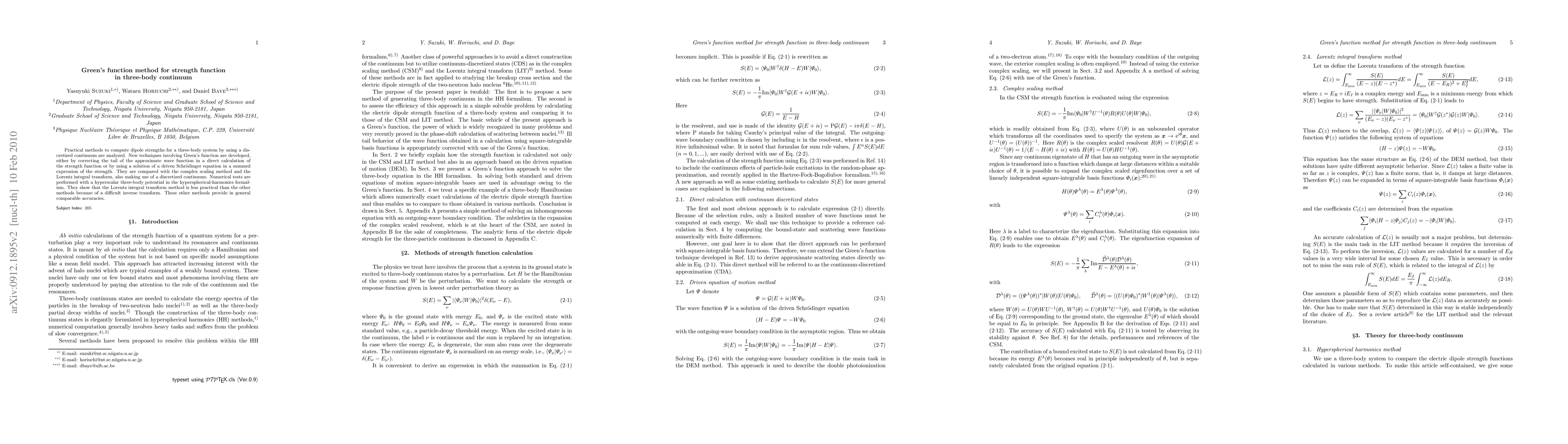 This paper develops new Green's function techniques for computing dipole strengths in three-body systems within a discretized continuum, comparing them to the complex scaling method and Lorentz integral transform. The proposed methods show comparable accuracy, while the Lorentz integral transform is deemed less practical due to difficulties in inverse transformation.