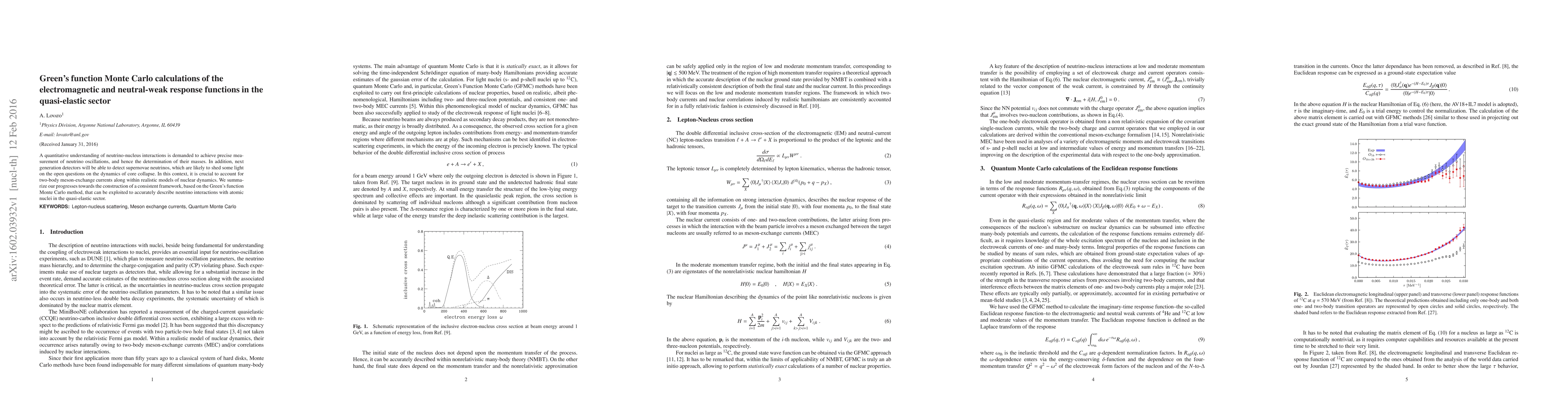 A quantitative understanding of neutrino-nucleus interactions is demanded to achieve precise measurement of neutrino oscillations, and hence the determination of their masses. In addition, next generation detectors will be able to detect supernovae neutrinos, which are likely to shed some light on the open questions on the dynamics of core collapse. In this context, it is crucial to account for two-body meson-exchange currents along within realistic models of nuclear dynamics. We summarize our progresses towards the construction of a consistent framework, based on the Green's function Monte Carlo method, that can be exploited to accurately describe neutrino interactions with atomic nuclei in the quasi-elastic sector.