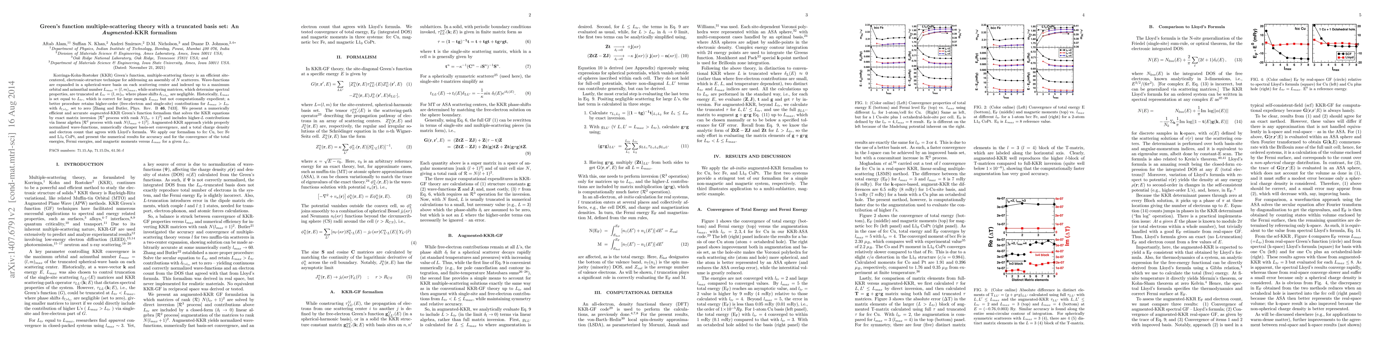 Korringa-Kohn-Rostoker (KKR) Green's function, multiple-scattering theory is an efficient site-centered, electronic-structure technique for addressing an assembly of $N$ scatterers. Wave-functions are expanded in a spherical-wave basis on each scattering center and indexed up to a maximum orbital and azimuthal number $L_{max}=(l,m)_{max}$, while scattering matrices, which determine spectral properties, are truncated at $L_{tr}=(l,m)_{tr}$ where phase shifts $\delta_{l>l_{tr}}$ are negligible. Historically, $L_{max}$ is set equal to $L_{tr}$; however, a more proper procedure retains free-electron and single-site contributions for $L_{max}>L_{tr}$ with $\delta_{l>l_{tr}}$ set to zero [Zhang and Butler, Phys. Rev. B {\bf 46}, 7433]. We present a numerically efficient and accurate \emph{augmented}-KKR Green's function formalism that solves the KKR secular equations by matrix inversion [$\mathcal{R}^3$ process with rank $N(l_{tr}+1)^2$] and includes higher-order $L$ contributions via linear algebra [$\mathcal{R}^2$ process with rank $N(l_{max}+1)^2$]. Augmented-KKR yields properly normalized wave-functions, numerically cheaper basis-set convergence, and a total charge density and electron count that agrees with Lloyd's formula. For fcc Cu, bcc Fe and L$1_0$ CoPt, we present the formalism and numerical results for accuracy and for the convergence of the total energies, Fermi energies, and magnetic moments versus $L_{max}$ for a given $L_{tr}$.
