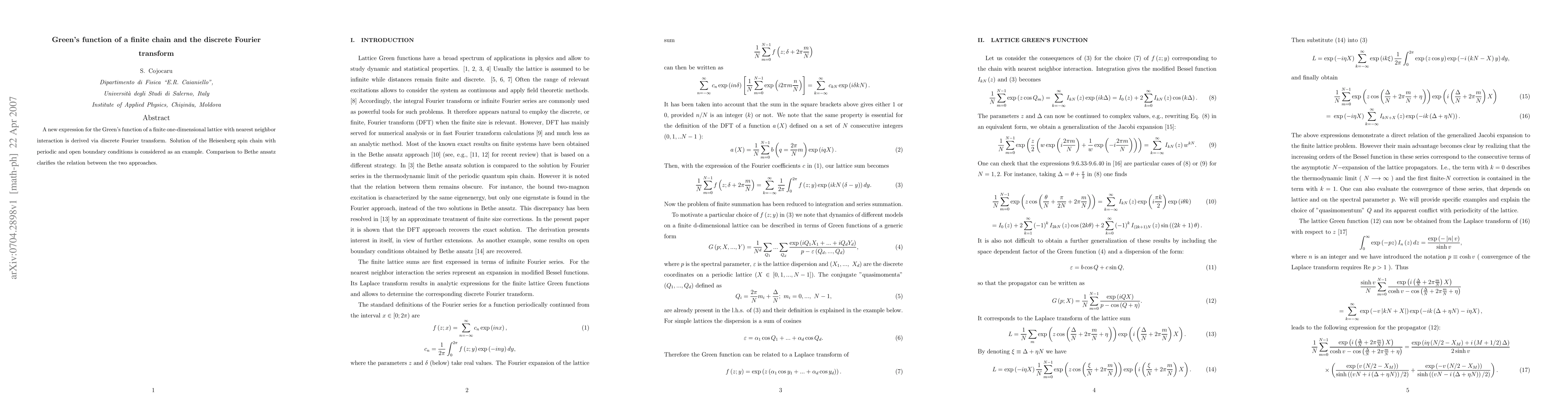 This paper derives a new expression for the Green's function of a finite one-dimensional lattice using the discrete Fourier transform, and applies it to solve the Heisenberg spin chain under different boundary conditions, comparing it to the Bethe ansatz method.