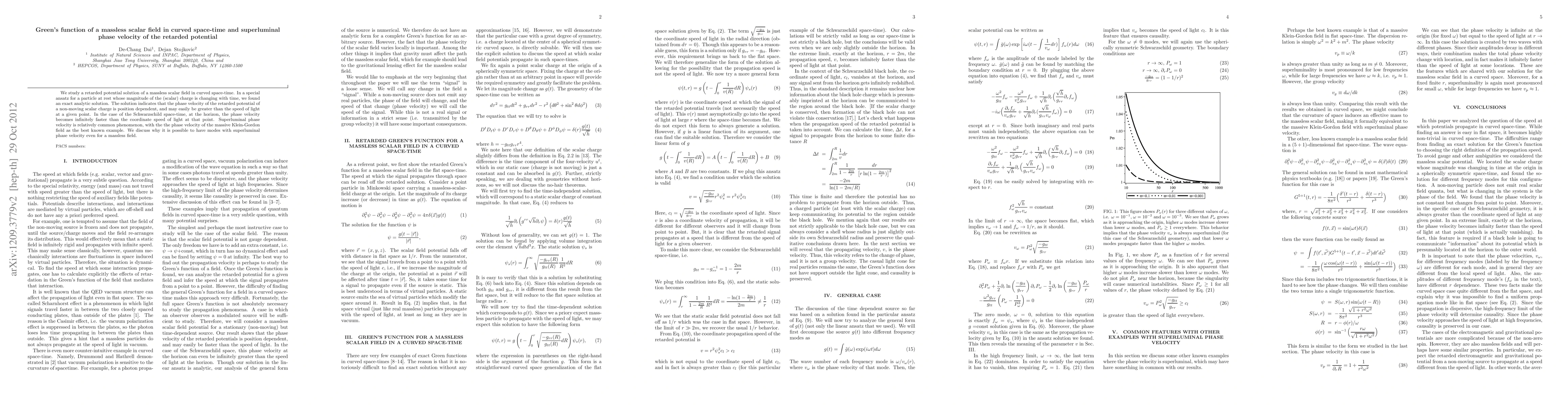 We study a retarded potential solution of a massless scalar field in curved space-time. In a special ansatz for a particle at rest whose magnitude of the (scalar) charge is changing with time, we found an exact analytic solution. The solution indicates that the phase velocity of the retarded potential of a non-moving scalar charge is position dependent, and may easily be greater than the speed of light at a given point. In the case of the Schwarzschild space-time, at the horizon, the phase velocity becomes infinitely faster than the coordinate speed of light at that point. Superluminal phase velocity is relatively common phenomenon, with the the phase velocity of the massive Klein-Gordon field as the best known example. We discuss why it is possible to have modes with superluminal phase velocity even for a massless field.