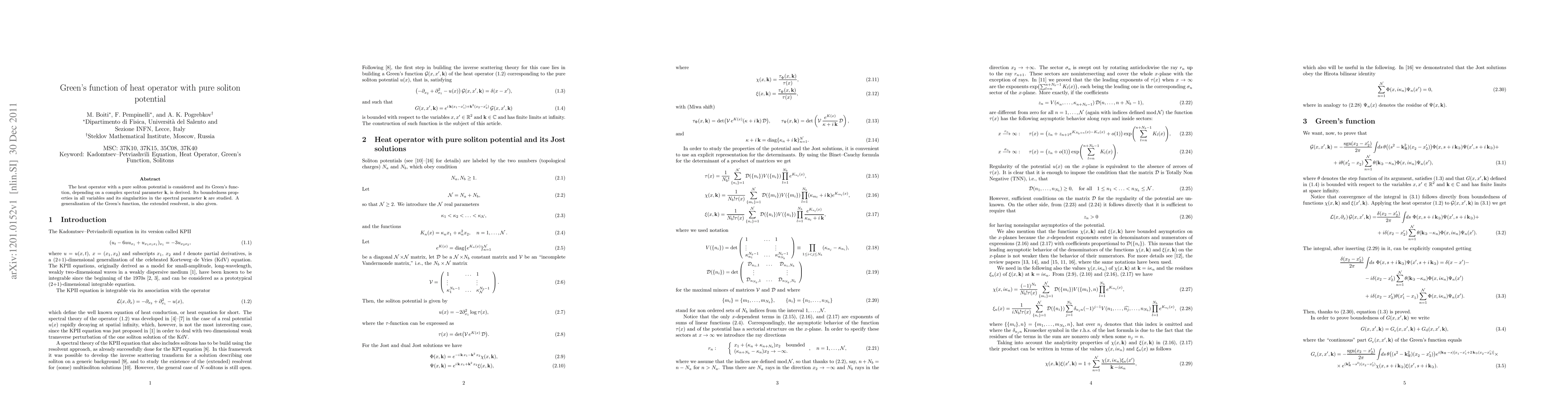 This paper derives the Green's function for the heat operator with a pure soliton potential, examining its boundedness and singularities in the spectral parameter k, and introduces an extended resolvent for generalization.