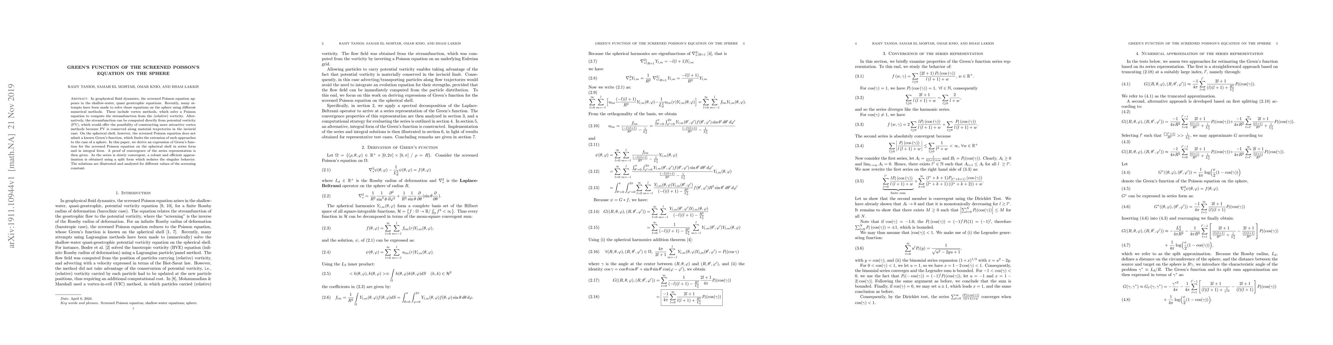 In geophysical fluid dynamics, the screened Poisson equation appears in the shallow-water, quasi geostrophic equations. Recently, many attempts have been made to solve those equations on the sphere using different numerical methods. These include vortex methods, which solve a Poisson equation to compute the stream-function from the (relative) vorticity. Alternatively, the stream-function can be computed directly from potential vorticity (PV), which would offer the possibility of constructing more attractive vortex methods because PV is conserved along material trajectories in the inviscid case. On the spherical shell, however, the screened Poisson equation does not admit a known Green's function, which limits the extension of such approaches to the case of a sphere. In this paper, we derive an expression of Green's function for the screened Poisson equation on the spherical shell in series form and in integral form. A proof of convergence of the series representation is then given. As the series is slowly convergent, a robust and efficient approximation is obtained using a split form which isolates the singular behavior. The solutions are illustrated and analyzed for different values of the screening constant.