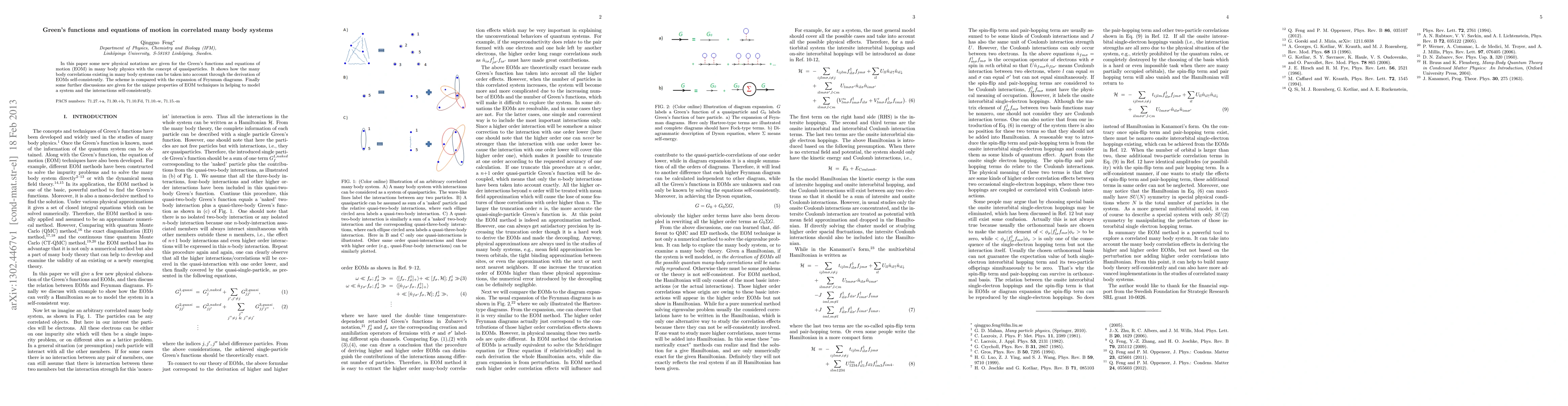 The paper introduces new notations for Green's functions and equations of motion (EOM) in many-body physics, utilizing the concept of quasiparticles to account for many-body correlations self-consistently. It compares this scheme with Feynman diagram expansions.