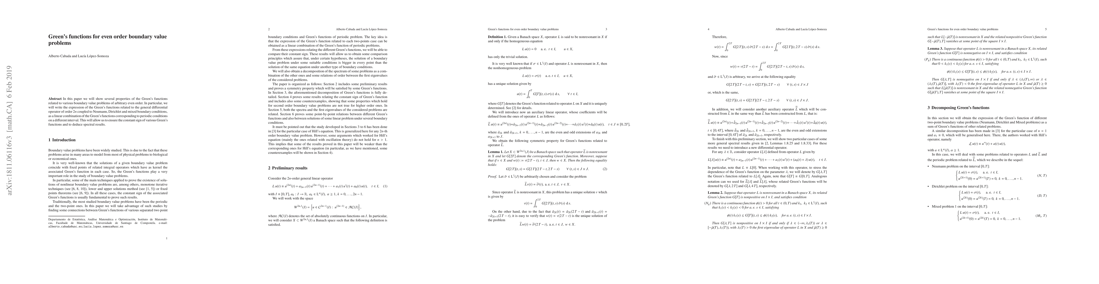 The paper explores properties of Green's functions associated with various even-order boundary value problems, utilizing linear combinations of Green's functions corresponding to periodic conditions on a different interval.