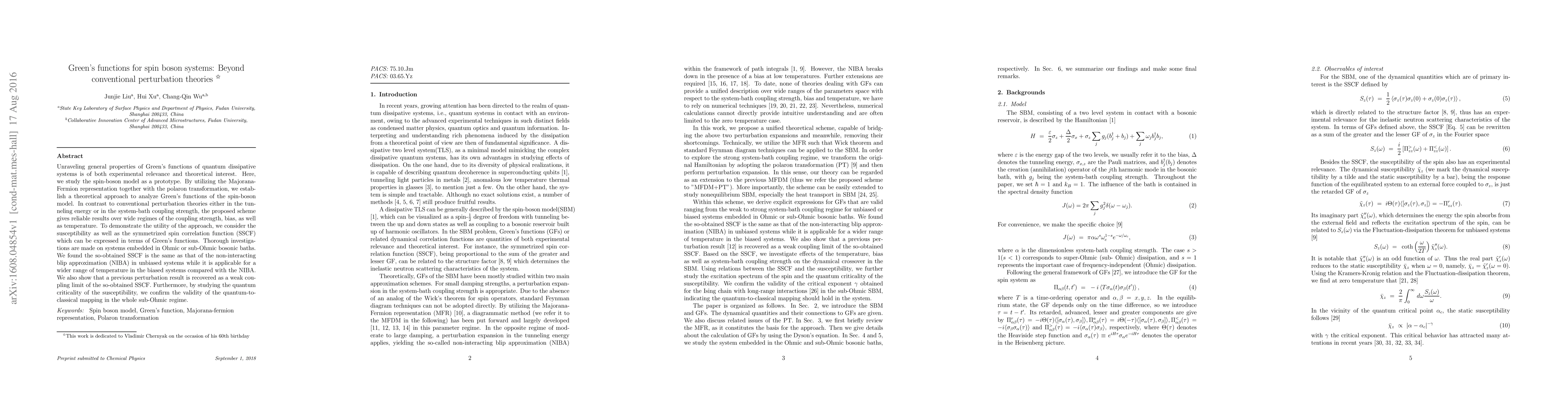 Unraveling general properties of Green's functions of quantum dissipative systems is of both experimental relevance and theoretical interest. Here, we study the spin-boson model as a prototype. By utilizing the Majorana- Fermion representation together with the polaron transformation, we establish a theoretical approach to analyze Green's functions of the spin-boson model. In contrast to conventional perturbation theories either in the tunneling energy or in the system-bath coupling strength, the proposed scheme gives reliable results over wide regimes of the coupling strength, bias, as well as temperature. To demonstrate the utility of the approach, we consider the susceptibility as well as the symmetrized spin correlation function (SSCF) which can be expressed in terms of Green's functions. Thorough investigations are made on systems embedded in Ohmic or sub-Ohmic bosonic baths. We found the so-obtained SSCF is the same as that of the non-interacting blip approximation (NIBA) in unbiased systems while it is applicable for a wider range of temperature in the biased systems compared with the NIBA. We also show that a previous perturbation result is recovered as a weak coupling limit of the so-obtained SSCF. Furthermore, by studying the quantum criticality of the susceptibility, we confirm the validity of the quantum-toclassical mapping in the whole sub-Ohmic regime.