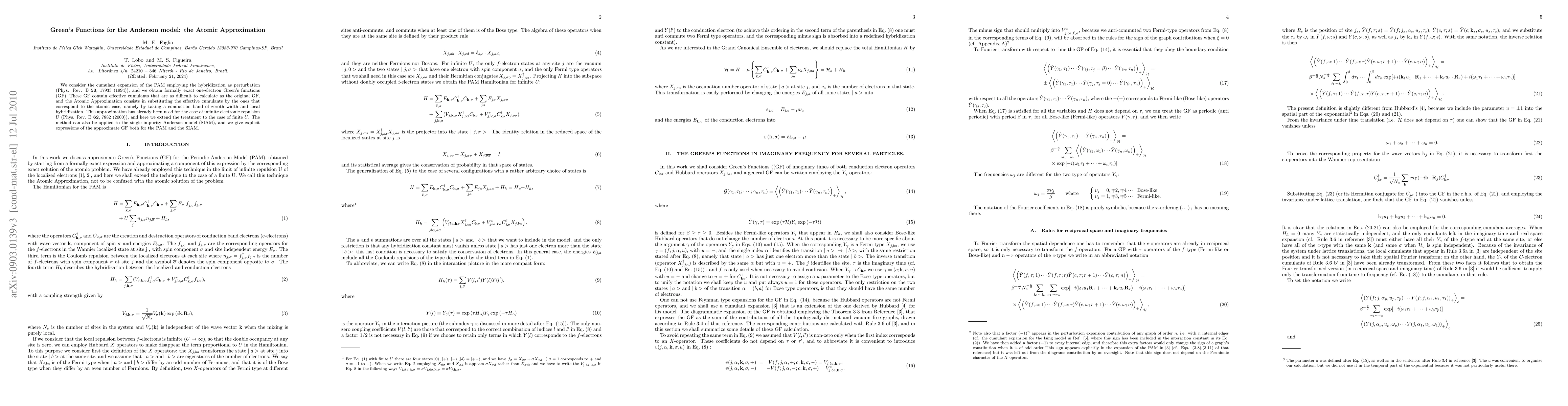 We consider the cumulant expansion of the PAM employing the hybridization as perturbation (Phys. Rev. B 50, 17933 (1994)), and we obtain formally exact one-electron Green's functions (GF). These GF contain effective cumulants that are as difficult to calculate as the original GF, and the Atomic Approximation consists in substituting the effective cumulants by the ones that correspond to the atomic case, namely by taking a conduction band of zeroth width and local hybridization. This approximation has already been used for the case of infinite electronic repulsion U (Phys. Rev. B 62, 7882 (2000)), and here we extend the treatment to the case of finite U. The method can also be applied to the single impurity Anderson model (SIAM), and we give explicit expressions of the approximate GF both for the PAM and the SIAM.