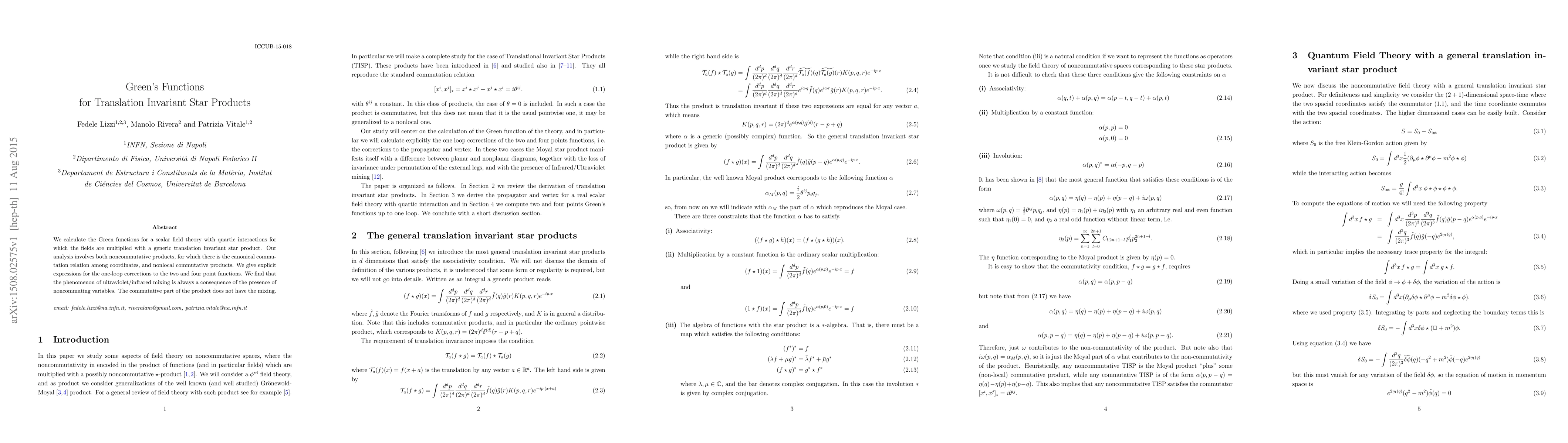 We calculate the Green functions for a scalar field theory with quartic interactions for which the fields are multiplied with a generic translation invariant star product. Our analysis involves both noncommutative products, for which there is the canonical commutation relation among coordinates, and nonlocal commutative products. We give explicit expressions for the one-loop corrections to the two and four point functions. We find that the phenomenon of ultraviolet/infrared mixing is always a consequence of the presence of noncommuting variables. The commutative part of the product does not have the mixing.