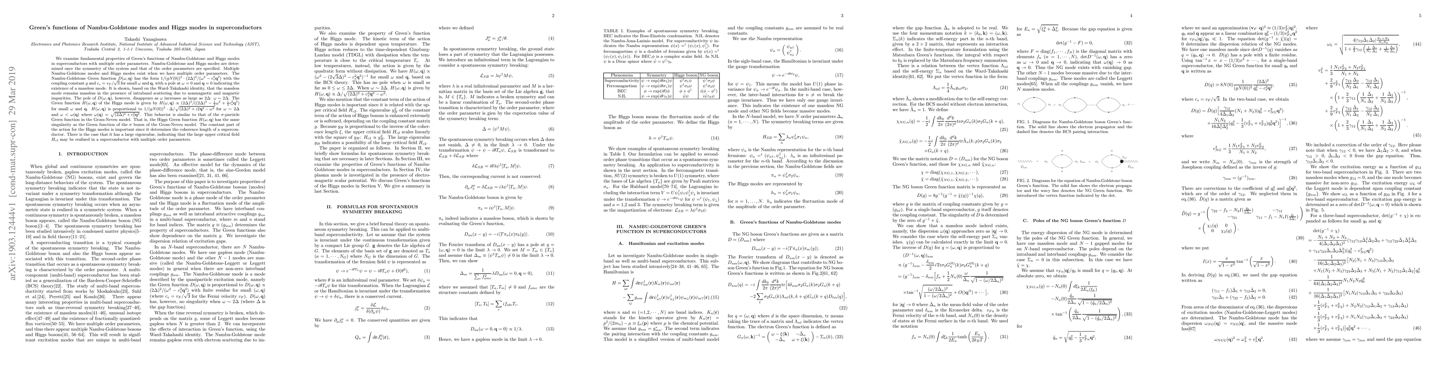 This paper investigates the Green's functions of Nambu-Goldstone and Higgs modes in superconductors with multiple order parameters, revealing that the Nambu-Goldstone mode remains massless despite scattering, while the Higgs mode's behavior mirrors that of the $\sigma$-particle in the Gross-Neveu model, influencing the superconductor's coherence length and potentially large upper critical field $H_{c2}$.