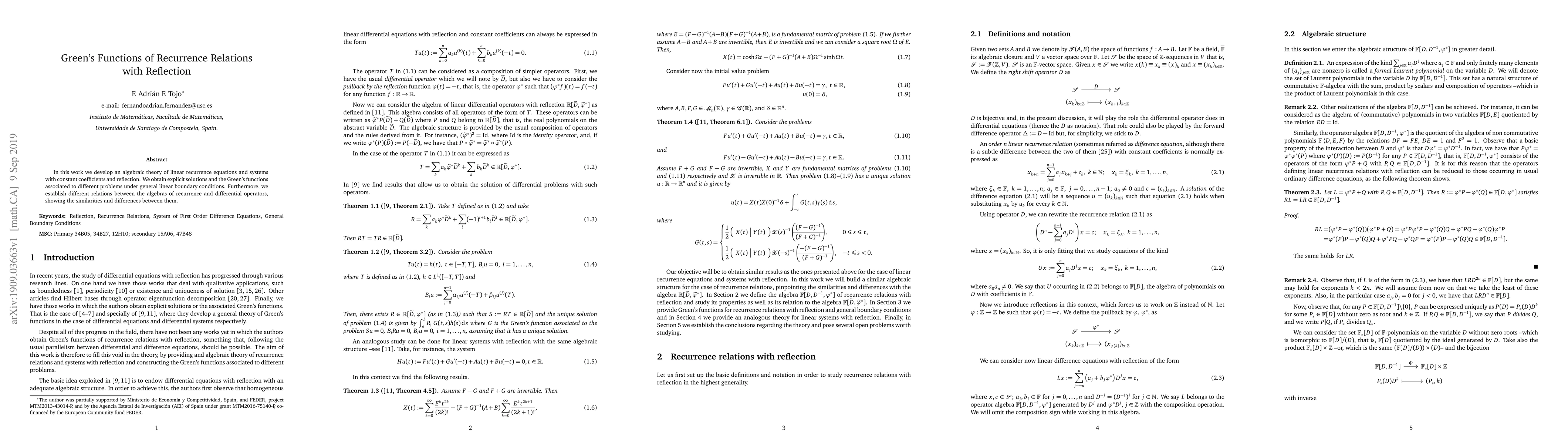In this work we develop an algebraic theory of linear recurrence equations and systems with constant coefficients and reflection. We obtain explicit solutions and the Green's functions associated to different problems under general linear boundary conditions. Furthermore, we establish different relations between the algebras of recurrence and differential operators, showing the similarities and differences between them.