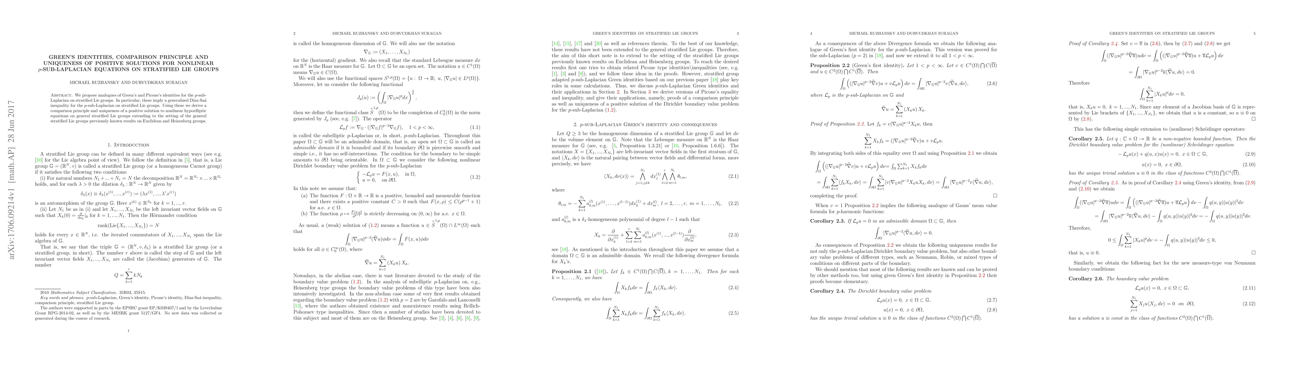 This paper develops analogues of Green's and Picone's identities for the $p$-sub-Laplacian on stratified Lie groups, leading to a generalised D\'iaz-Sa\'a inequality. It uses these to establish a comparison principle and uniqueness of positive solutions for nonlinear hypoelliptic equations on stratified Lie groups.