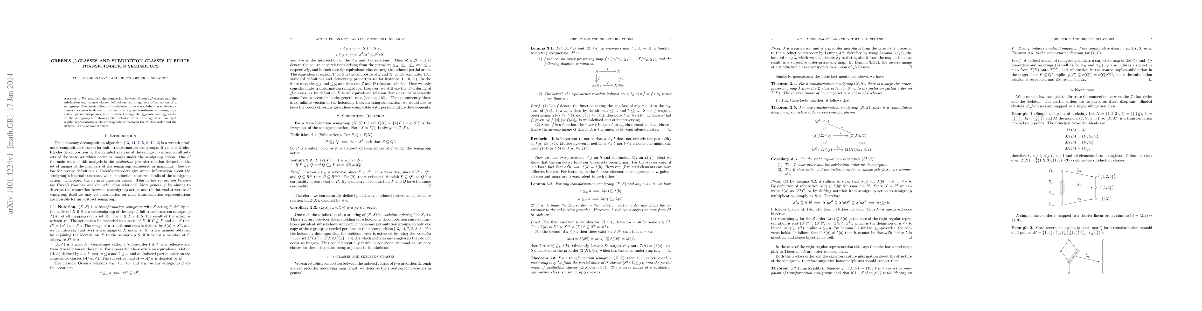 We establish the connection between Green's ${\mathcal J}$-classes and the subduction equivalence classes defined on the image sets of an action of a semigroup. The construction of the skeleton order (on subduction equivalence classes) is shown to depend in a functorial way on transformation semigroups and surjective morphisms, and to factor through the $\leq_{\mathcal L}$-order and $\leq_{\mathcal J}$-order on the semigroup and through the inclusion order on image sets. For right regular representations, the correspondence between the ${\mathcal J}$-class order and the skeleton is one of isomorphism.