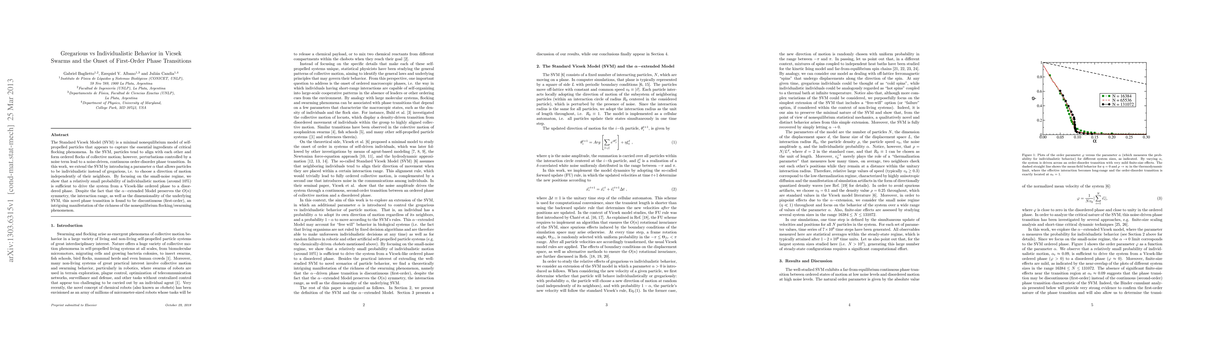 The Standard Vicsek Model (SVM) is a minimal nonequilibrium model of self-propelled particles that appears to capture the essential ingredients of critical flocking phenomena. In the SVM, particles tend to align with each other and form ordered flocks of collective motion; however, perturbations controlled by a noise term lead to a noise-driven, continuous order-disorder phase transition. In this work, we extend the SVM by introducing a parameter $\alpha$ that allows particles to be individualistic instead of gregarious, i.e. to choose a direction of motion independently of their neighbors. By focusing on the small-noise regime, we show that a relatively small probability of individualistic motion (around 10%) is sufficient to drive the system from a Vicsek-like ordered phase to a disordered phase. Despite the fact that the $\alpha-$extended Model preserves the O(n) symmetry, the interaction range, as well as the dimensionality of the underlying SVM, this novel phase transition is found to be discontinuous (first-order), an intriguing manifestation of the richness of the nonequilibrium flocking/swarming phenomenon.