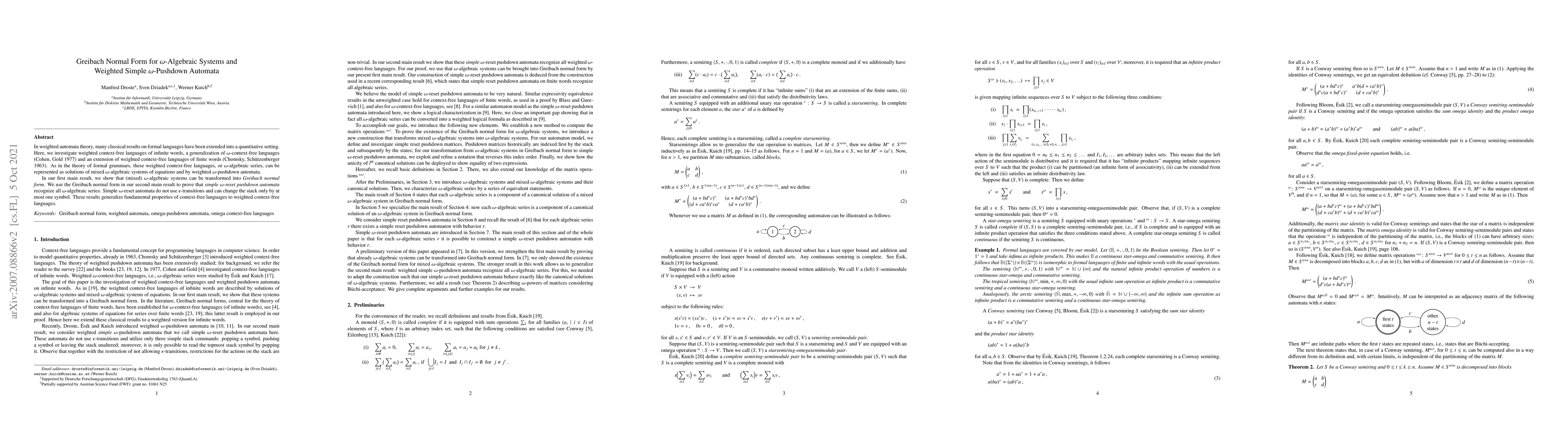 This paper extends classical results from formal grammars to weighted context-free languages of infinite words, demonstrating that mixed $\omega$-algebraic systems can be transformed into Greibach normal form. It also shows that simple $\omega$-reset pushdown automata recognize all $\omega$-algebraic series, generalizing properties of context-free languages to their weighted counterparts.