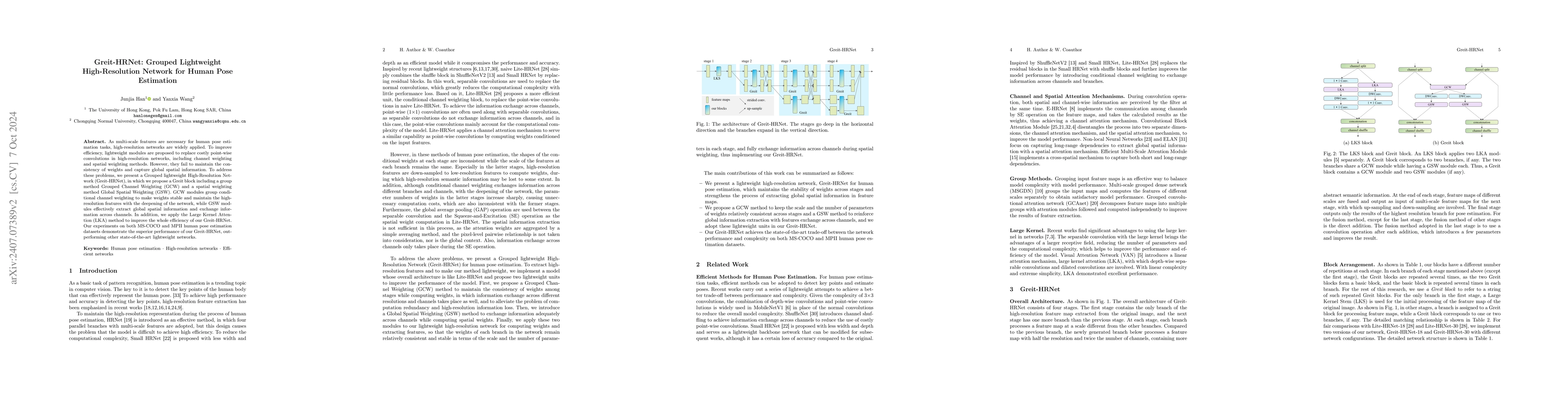 The paper introduces Greit-HRNet, a Grouped lightweight High-Resolution Network for human pose estimation, featuring Grouped Channel Weighting (GCW) and Global Spatial Weighting (GSW) to maintain consistency and capture global spatial information. The proposed method outperforms other lightweight networks on MS-COCO and MPII datasets.
